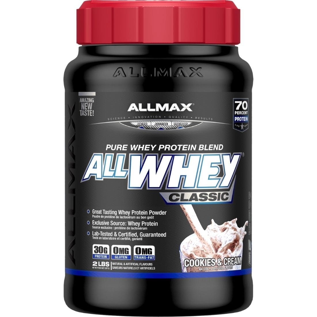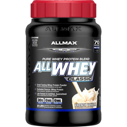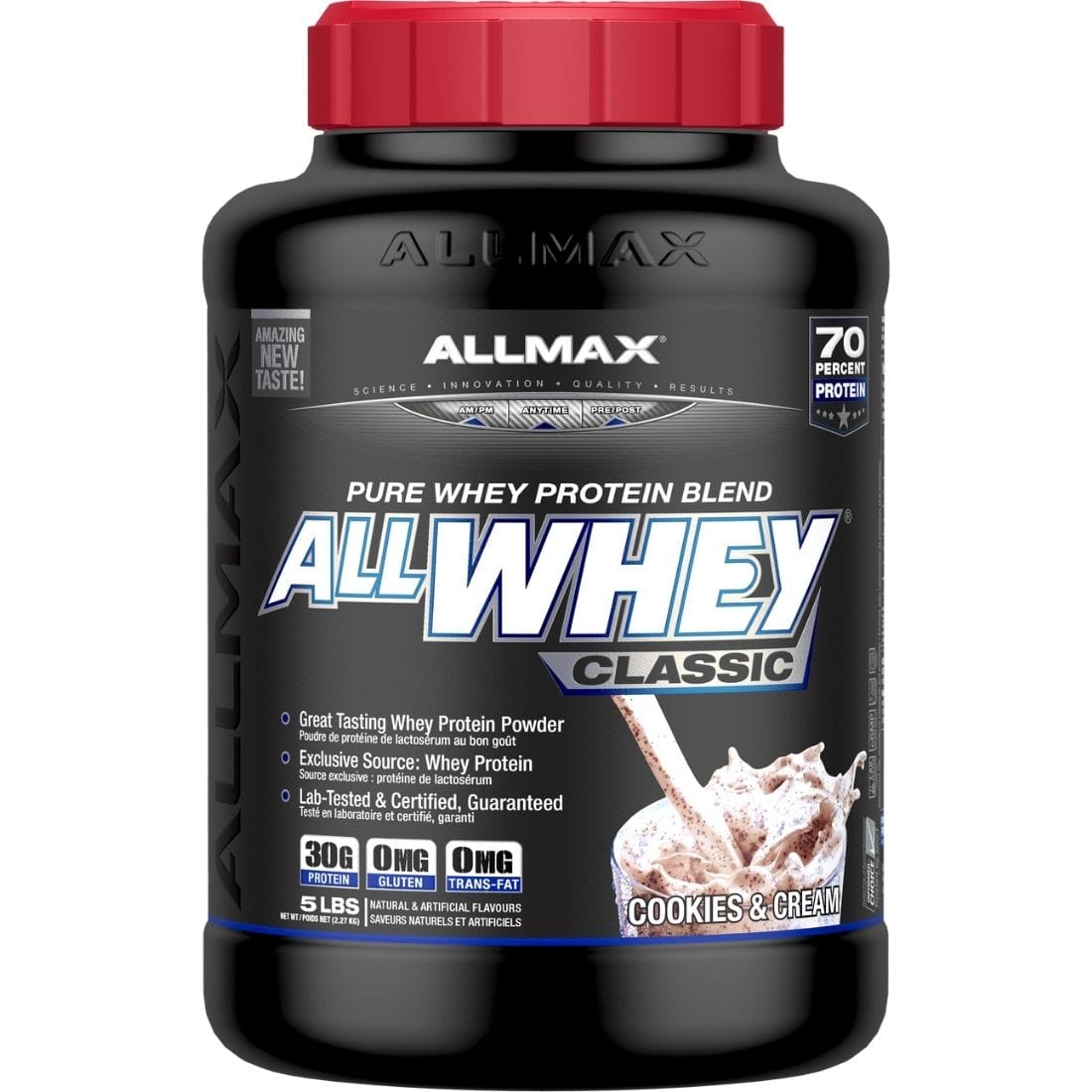 Allmax Allwhey gives you 100% Whey Protein Blend in a 3-Stage NitriCore™ Delivery System all with OmegaEFA™ and Tri-Blend Enzymes. ALLWHEY is fully Instantized, so it mixes easily and quickly in water or milk. ALLWHEY has an amazing taste that stands out as one of the best-tasting proteins on the market.