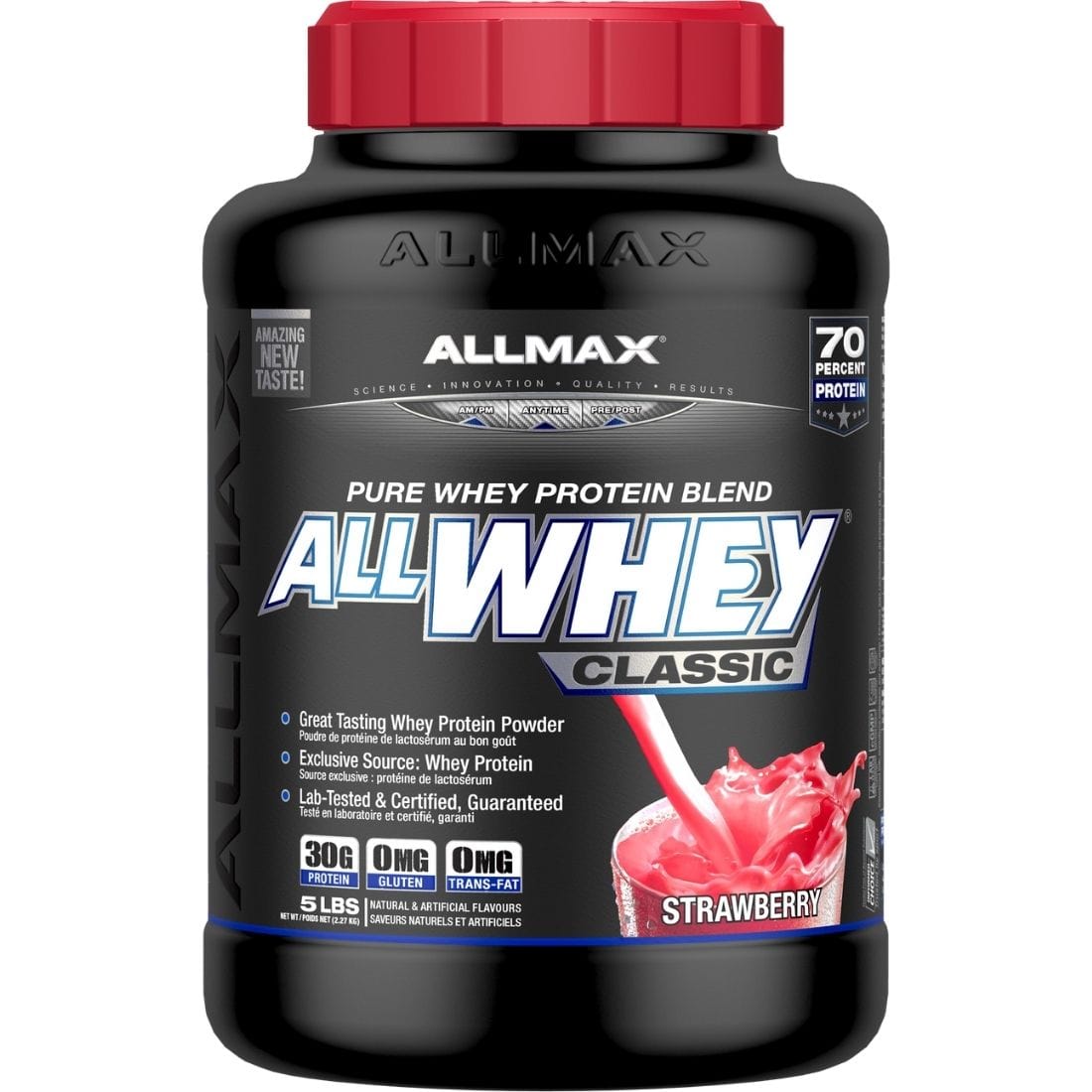 Allmax Allwhey comes in both 2 lb and 5 lb jars and is available in four flavors – Butterscotch Maple Fudge, Chocolate, Vanilla and Strawberry.