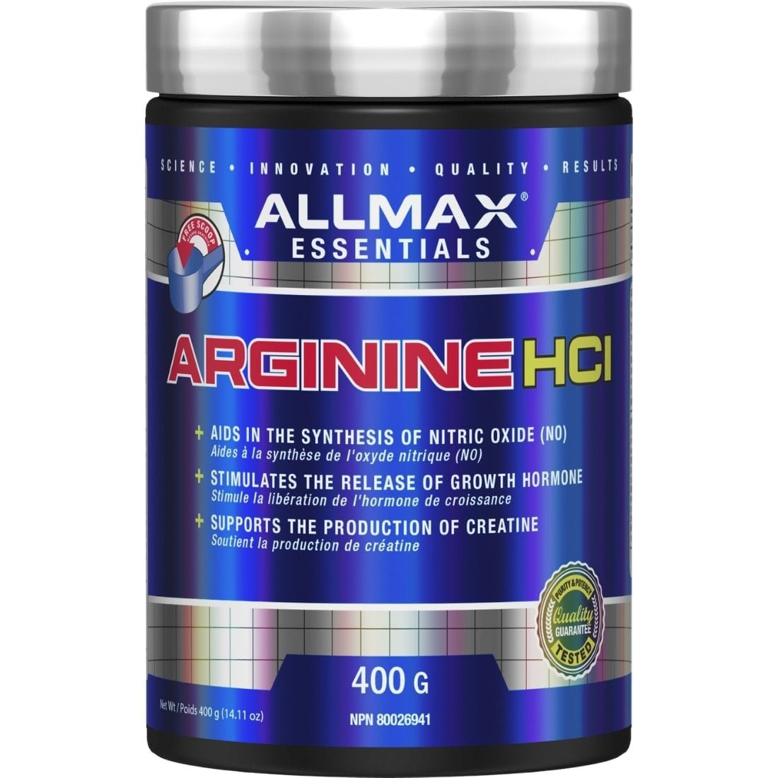 Allmax Arginine is available in 100 gram and 400 gram sizes.