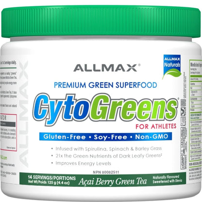 Allmax CytoGREENS is an extremely concentrated and highly potent greens formula, designed to accelerate recovery from exercise, improve stamina and increase endurance. CytoGREENS provides 21X the detoxifying chlorophyll as a serving of dark leafy greens with more B12 than an 8 oz steak and 100% complete bioavailable plant-based protein and 100% recommended daily intake of vitamin A.