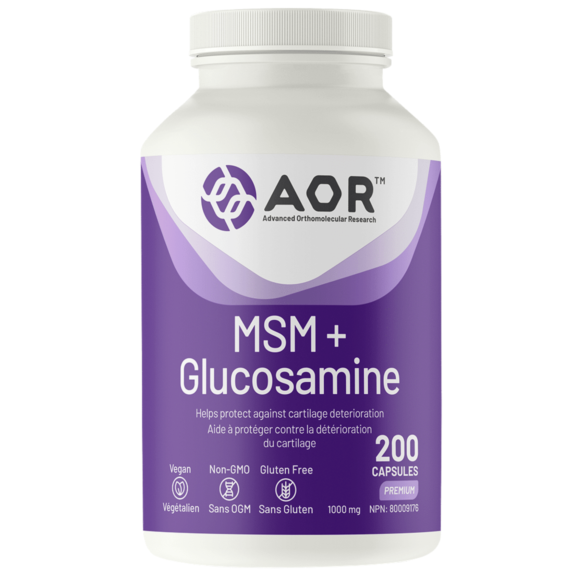 AOR MSM + Glucosamine combines 500 mg of MSM and 500 mg of glucosamine sulfate to support joint health, reduce osteoarthritis pain, and enhance mobility. Vegan, gluten-free, non-GMO.