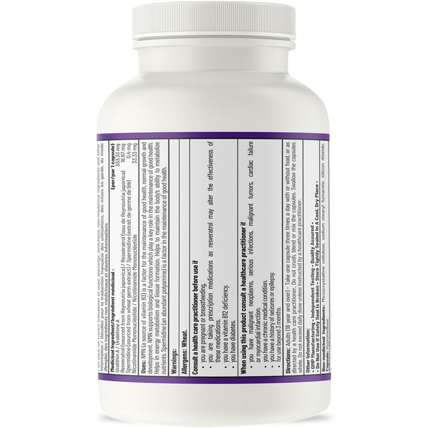 Supports Cellular Health: Urolithin A, NMN, resveratrol, and spermidine work together to promote healthy aging at the cellular level.