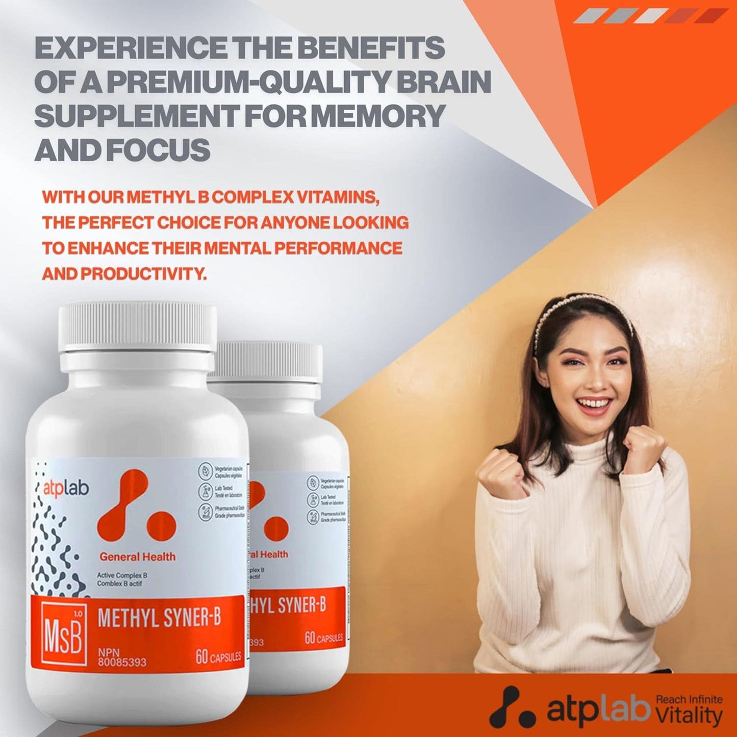 Unlock your potential with ATP Lab Methyl Syner-B, a dynamic blend of essential Vitamin B complex nutrients. Designed to fuel your body with the energy it needs, this formula supports tissue formation and maintains overall health. Each capsule delivers a powerhouse combination of Vitamin B1 (benfotiamine), B2 (Riboflavin 5-Phosphate sodium), B3 (Nicotinamide/niacinamide), B5 (Calcium Panthothenate and Pantethine), B6 (Pyridoxal-5-phosphate), B8 (biotin), B9 (5-Methyltetrahydrofolate), and B12 (Methyl Cobalamin), alongside Trimethylglycine for added efficacy. Say hello to healthier skin, hair, and nails, while supporting cognitive function, immune system health, and liver function.
