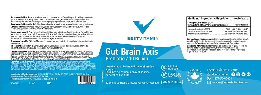 Bestvitamin Gut Brain Axis promotes a healthy mood balance, helps moderate general feelings of anxiety, and reduces stress-related gastrointestinal complications by positively modulating gut microflora.