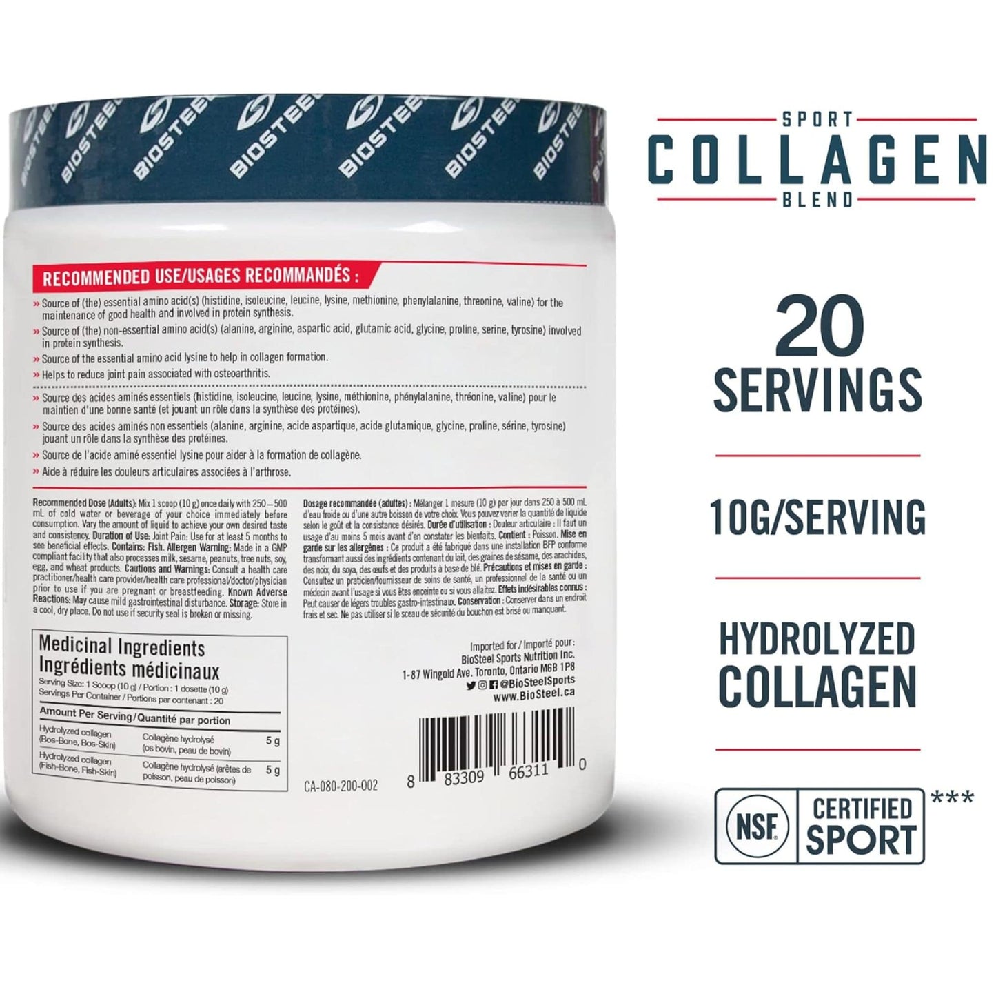 Each scoop of BioSteel’s Sport Collagen Blend powder is packed with a total of 10,000 mg of hydrolyzed marine and bovine collagen. Combined, these help build collagen and muscle and maintains overall good health. As we age, our collagen levels decline and need to be replenished. Easily stack this unflavoured powder in your shakes or your favourite BioSteel products to build your own custom creations, without compromising taste.