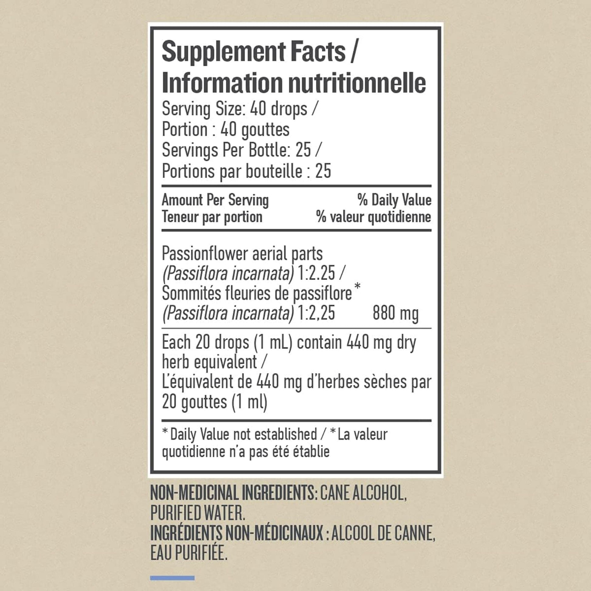 Take 30-40 drops (1.5-2 mL) of Botanica Passionflower taken 3 times per day.