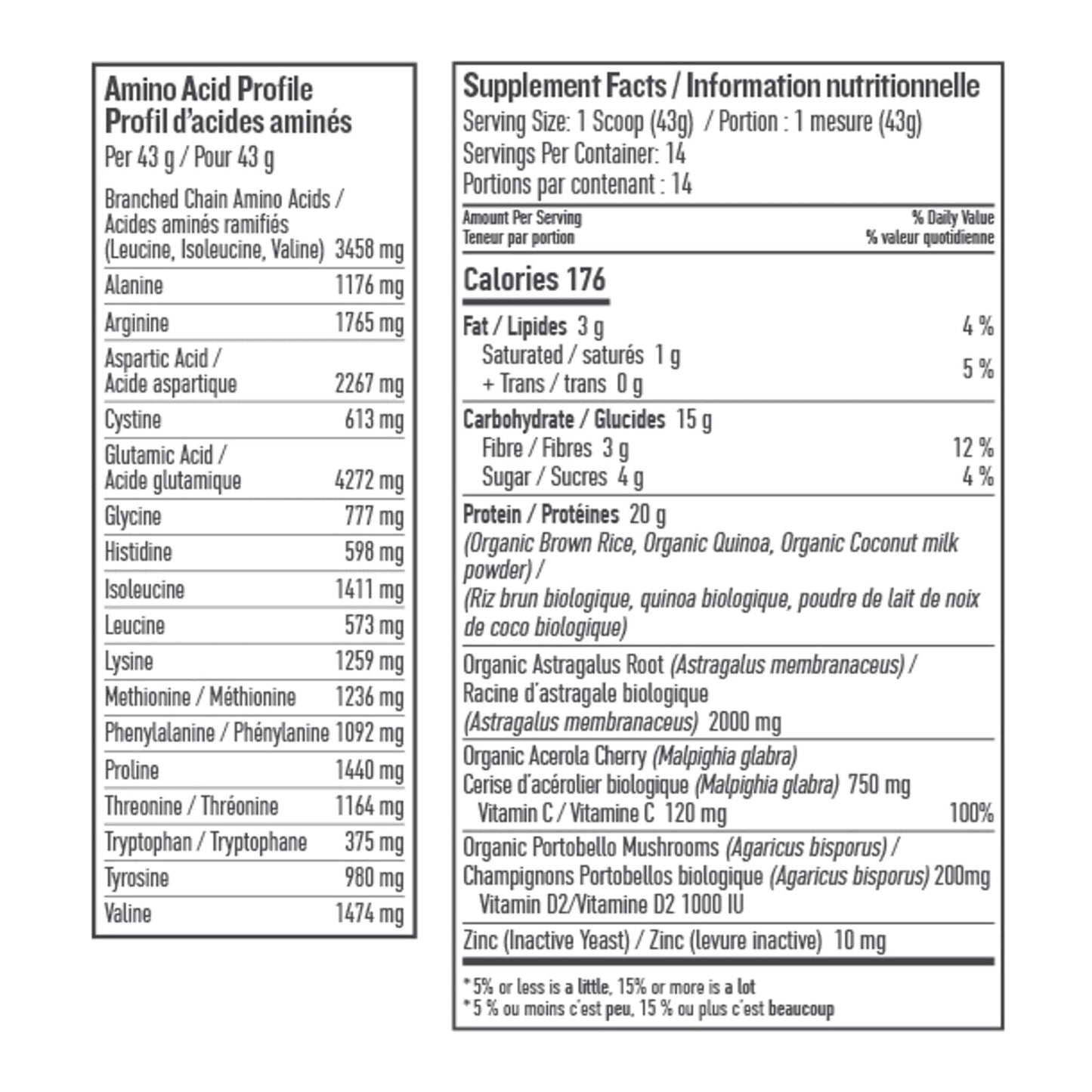 | Protein (Organic Brown Rice, Organic Quinoa, Organic Coconut Milk powder) | 20 g | |