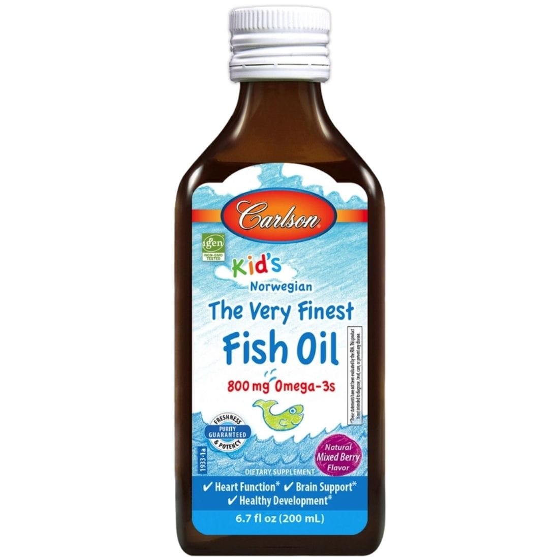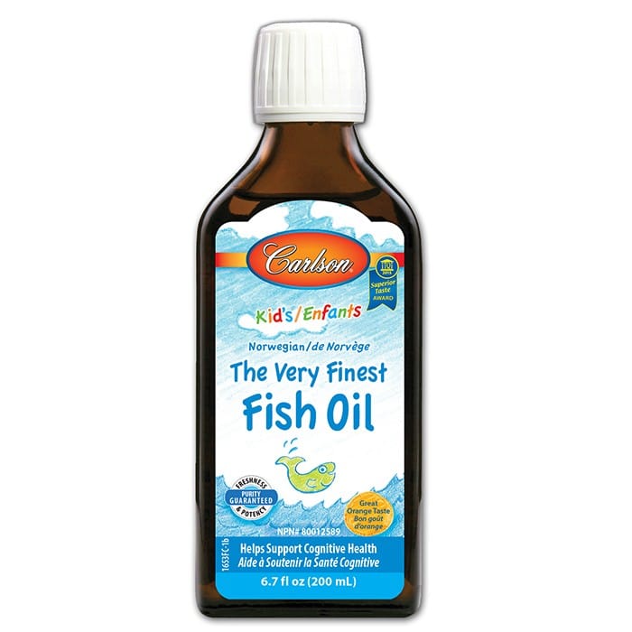 Carlson for Kids Very Finest Fish Oil has a great lemon taste and contains 800 mg of omega-3's in each ½ teaspoonful. Carlson for Kids Very Finest Fish Oil comes from cold-water fish found in deep Norwegian waters and is bottled in Norway to ensure maximum freshness. It is vitamin A & D free. Recent medical studies have shown the importance of omega-3's for healthy brain development and vision in growing children.