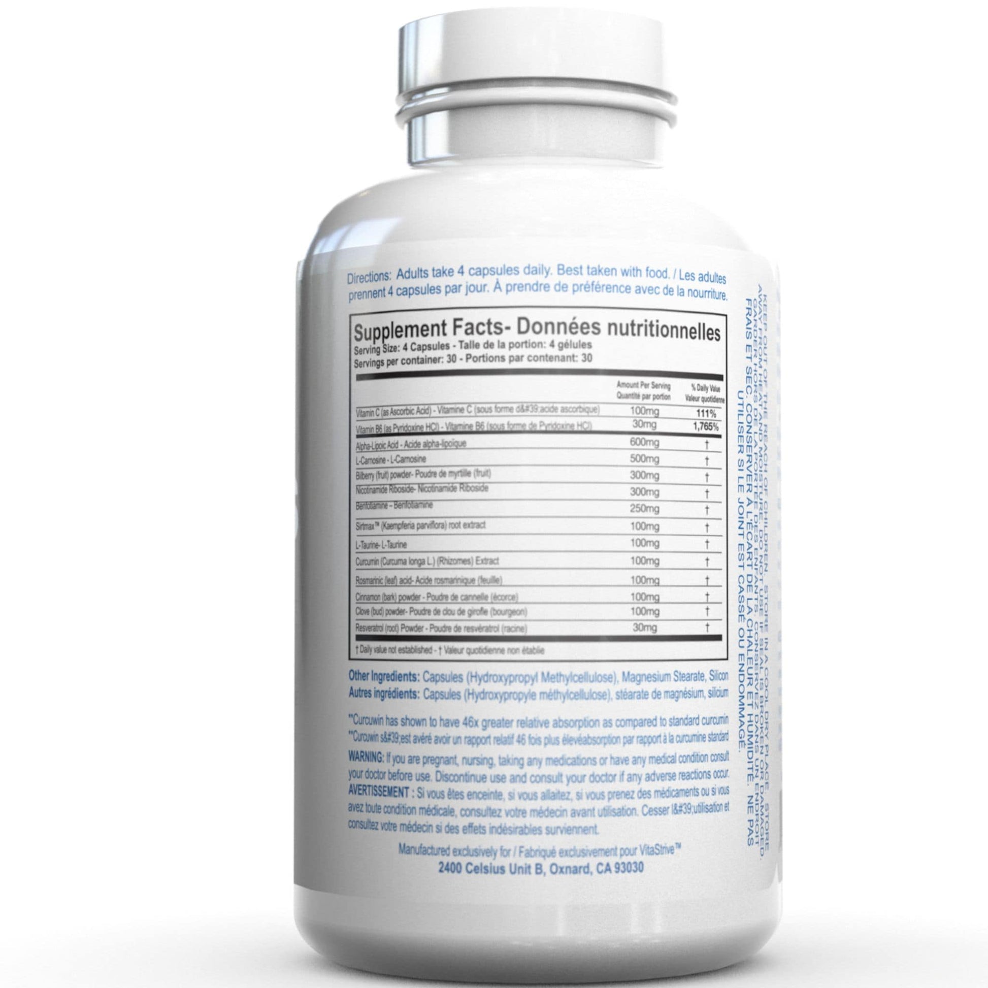 - Premium Antioxidant & Nutrient Blend: Includes Alpha-Lipoic Acid, L-Carnosine, Resveratrol, Bilberry, Curcumin, Sirtmax®, and more.
