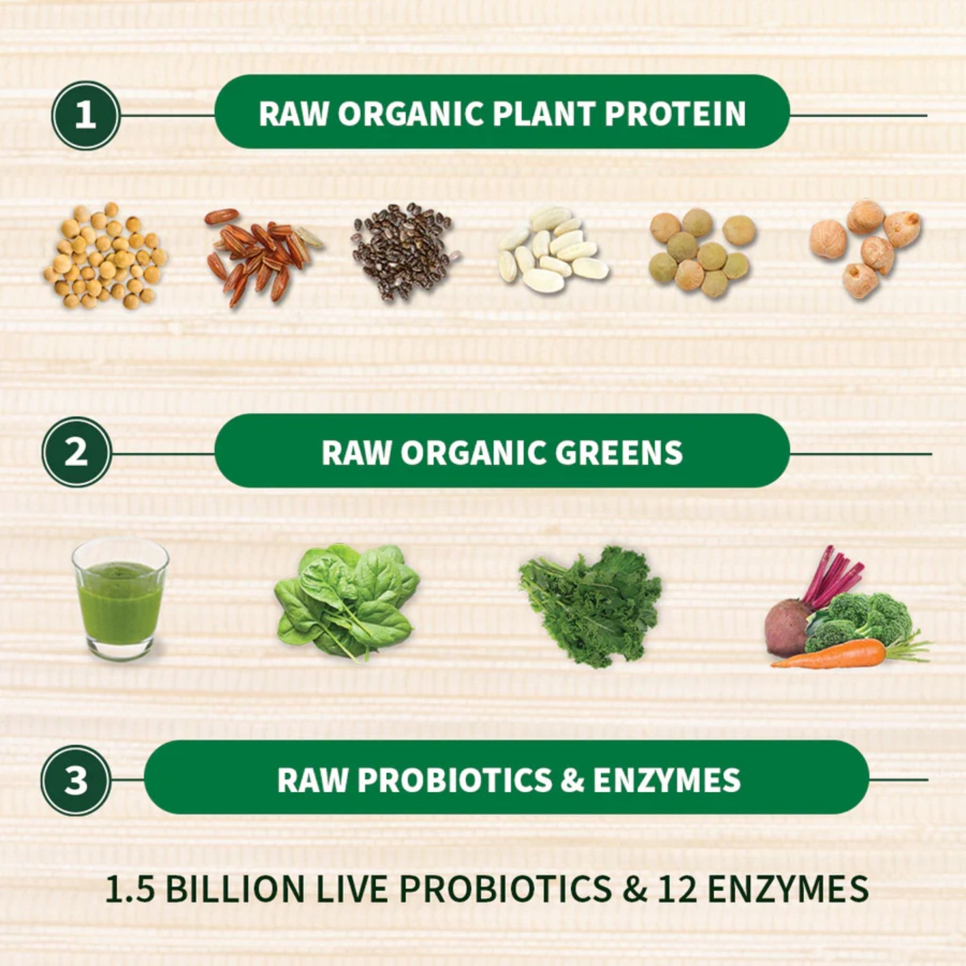 We combined the power of clean organic protein and the nutrient-rich energy of organic greens! RAW Protein & greens are CLEAN—Certified USDA Organic and Non-GMO Project Verified—and we think that CLEAN tastes better! Now you have even more choices with your protein: RAW Protein & greens—in a variety of available flavors, including Real RAW Vanilla, Chocolate Cacao, and Lightly Sweet. Offering 20 grams of smooth, raw organic plant protein per serving from organic sprouted brown rice, organic peas, organic chia, organic navy beans, organic lentil beans and organic garbanzo beans and 6 organic greens and veggies—organic alfalfa grass juice, organic spinach, organic kale, and organic broccoli, carrots and beets—1.5 billion CFU probiotics, 13 non-GMO enzymes, 3 grams of organic fiber and less than 1 gram of naturally occurring sugar, RAW Protein & greens is a delish way to get your protein and greens in one serving. And it’s CLEAN, TRACEABLE and PURE.