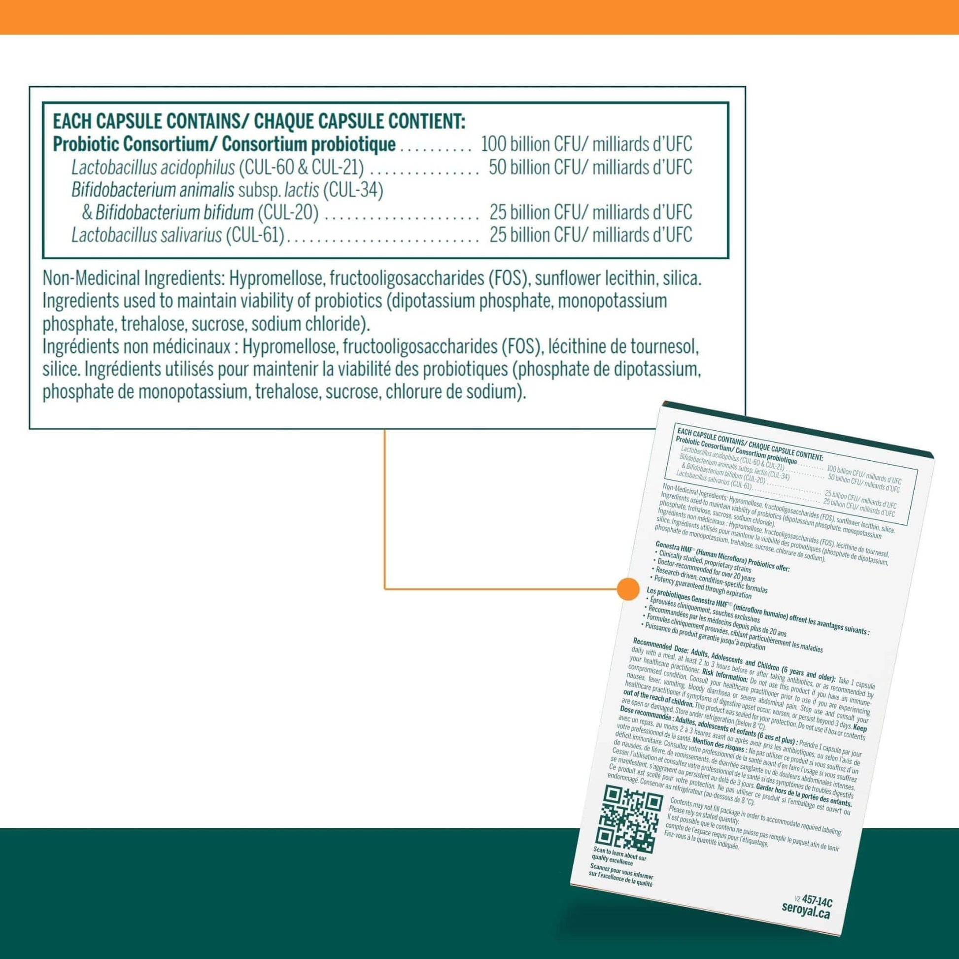 - Provides 100 billion CFU per dose from two strains of Lactobacillus acidophilus, Bifidobacterium bifidum, Bifidobacterium animalis subsp. lactis, and Lactobacillus salivarius