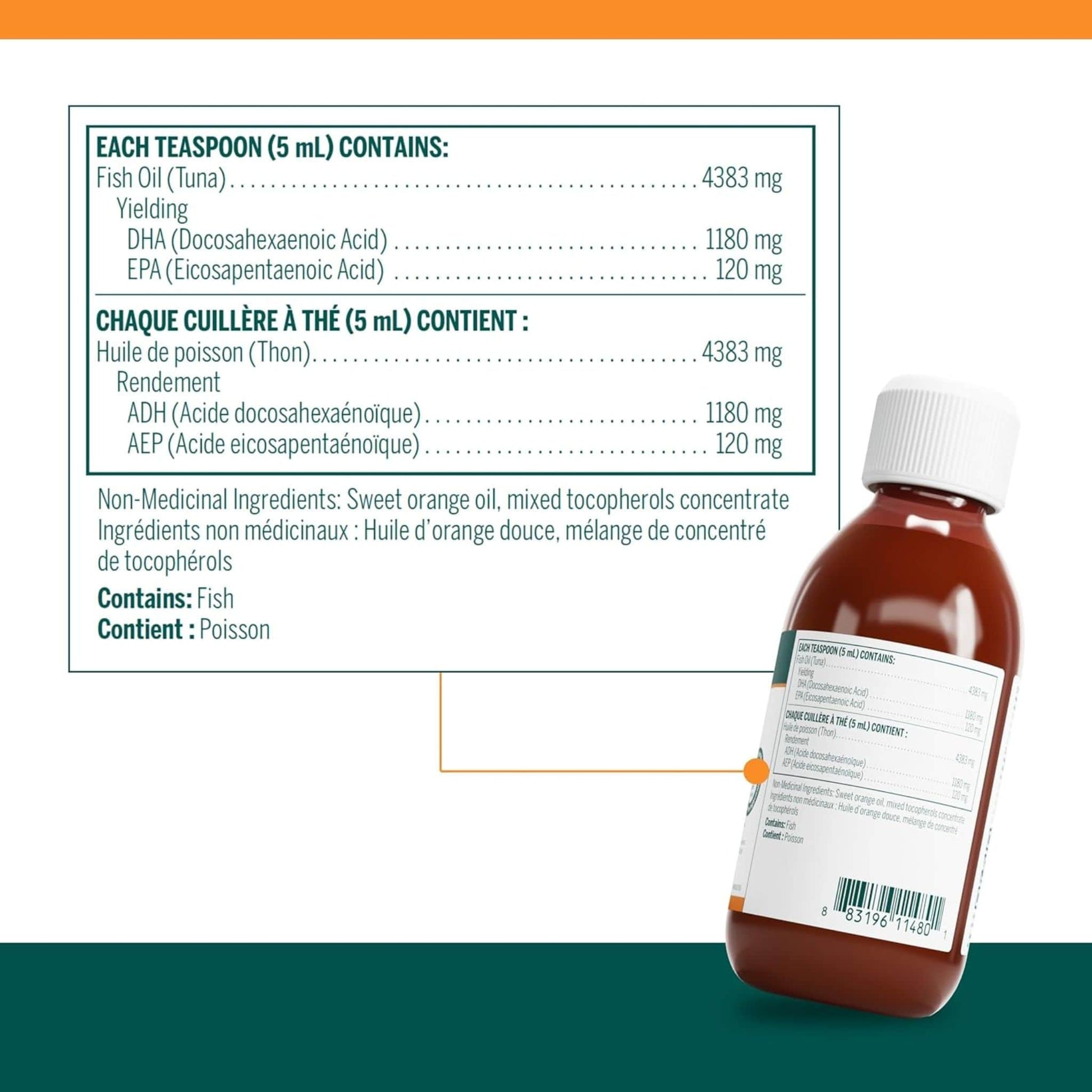 - Provides 1,200 mg of DHA and 260 mg EPA per teaspoon