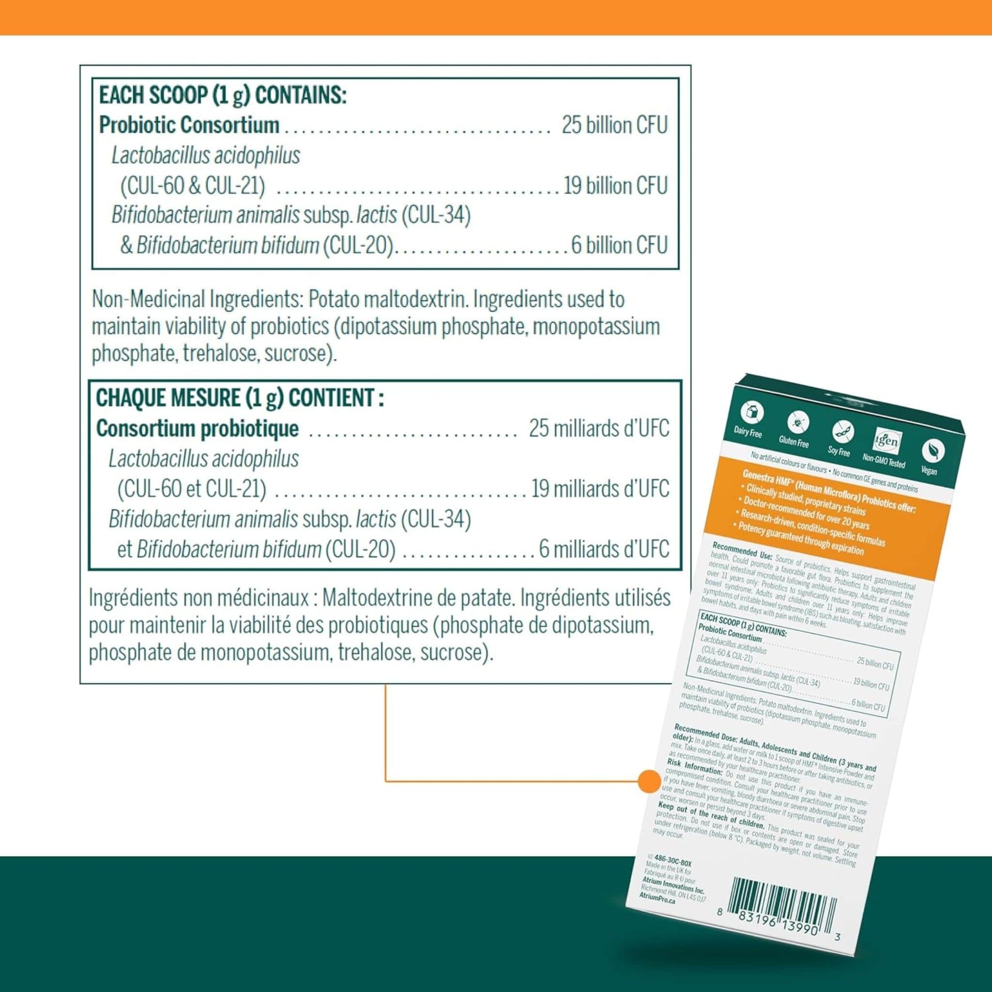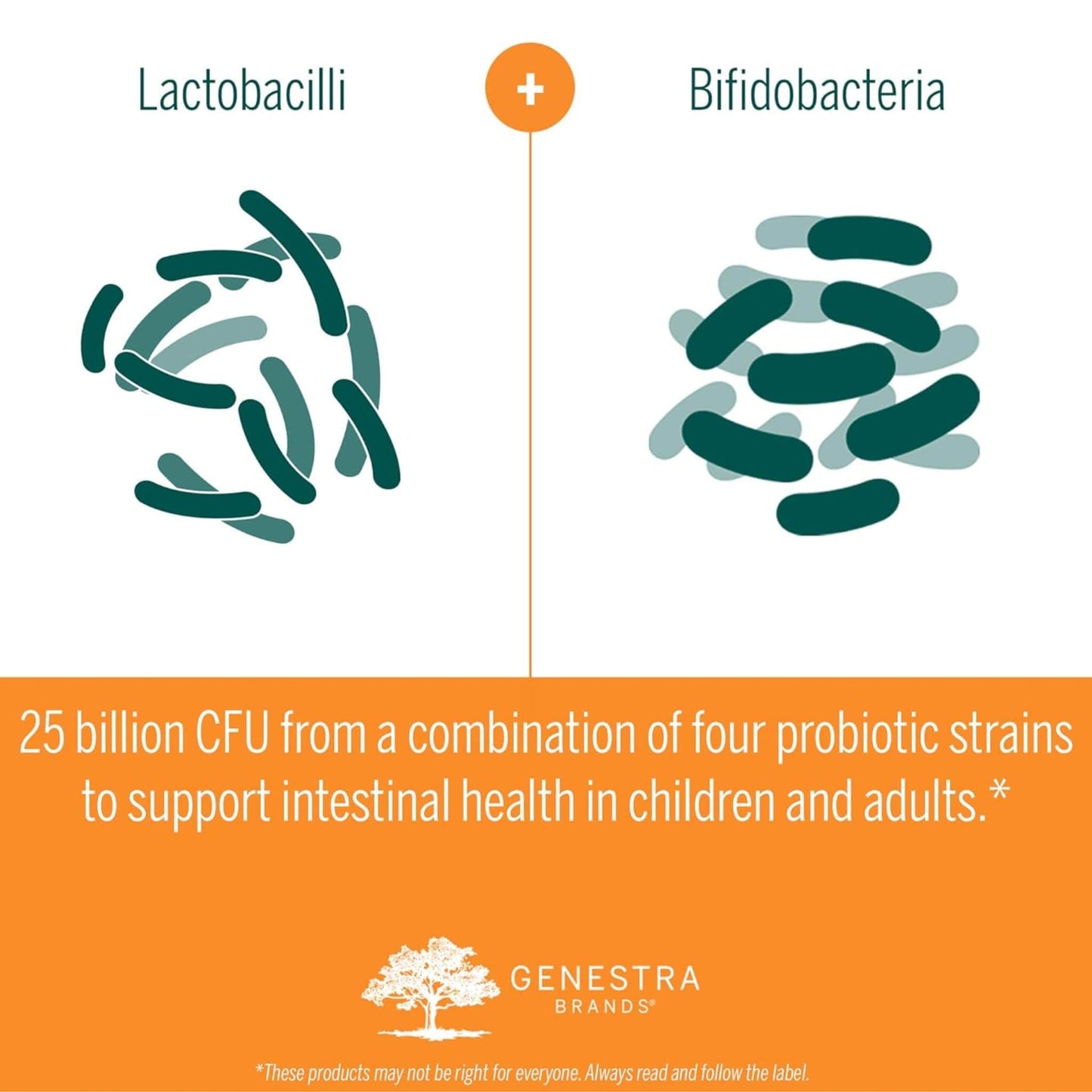 - Provides 25 billion CFU per day of two strains of Lactobacillus acidophilus, Bifidobacterium bifidum, and Bifidobacterium animalis subsp. lactis