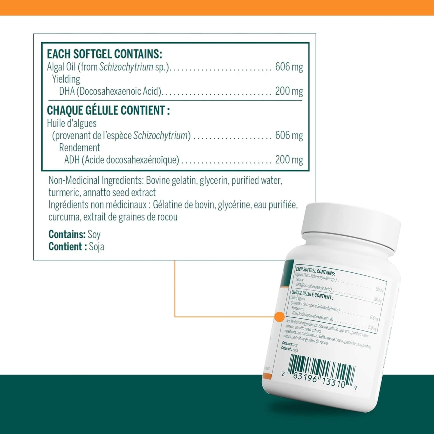 - Provides 400 mg DHA from algal oil per daily dose