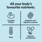 Strawberries & Cream: Protein blend (pea protein, milled golden flaxseed), Natural flavours, Soluble tapioca fibers, Coconut milk powder* (coconut milk powder*, tapioca maltodextrin*, acacia gum*), Medium chain triglycerides (medium chain triglycerides from coconut oil, tapioca maltodextrin), Acacia gum, Guar gum, Xanthan gum, Beetroot colour, Fruits, vegetables and mushrooms blend (spinach, broccoli, carrot, sweet potato, orange, apple, strawberry, sunflower seeds, shiitake mushroom, maitake mushroom, pomegranate juice powder*, acai juice powder*, goji juice powder*, grape juice powder*, amla fruit powder*, cranberry powder*, aronia powder*, sea buckthorn juice powder*, camu camu powder*, acerola juice powder*), Rebaudioside M, Salt, Citric acid, Bacterial culture and enzymes blend (rice maltodextrin, Bacillus subtilis, bromelain, papain).