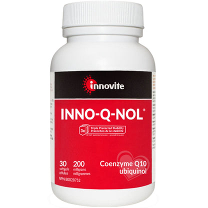 Innovite Health INNO-Q-NOL (CoQ10 Ubiquinol) 200mg with several times more heart and antioxidant activity. This is the active form of CoQ10 the circulates in the blood, however some people have difficulty making this form in the body. Using a stablizing process, Inno-Vite is able to maintain the potency of their Ubiquinol yielding higher quality therapeutic results. Oil based easy to swallow softgel capsule.