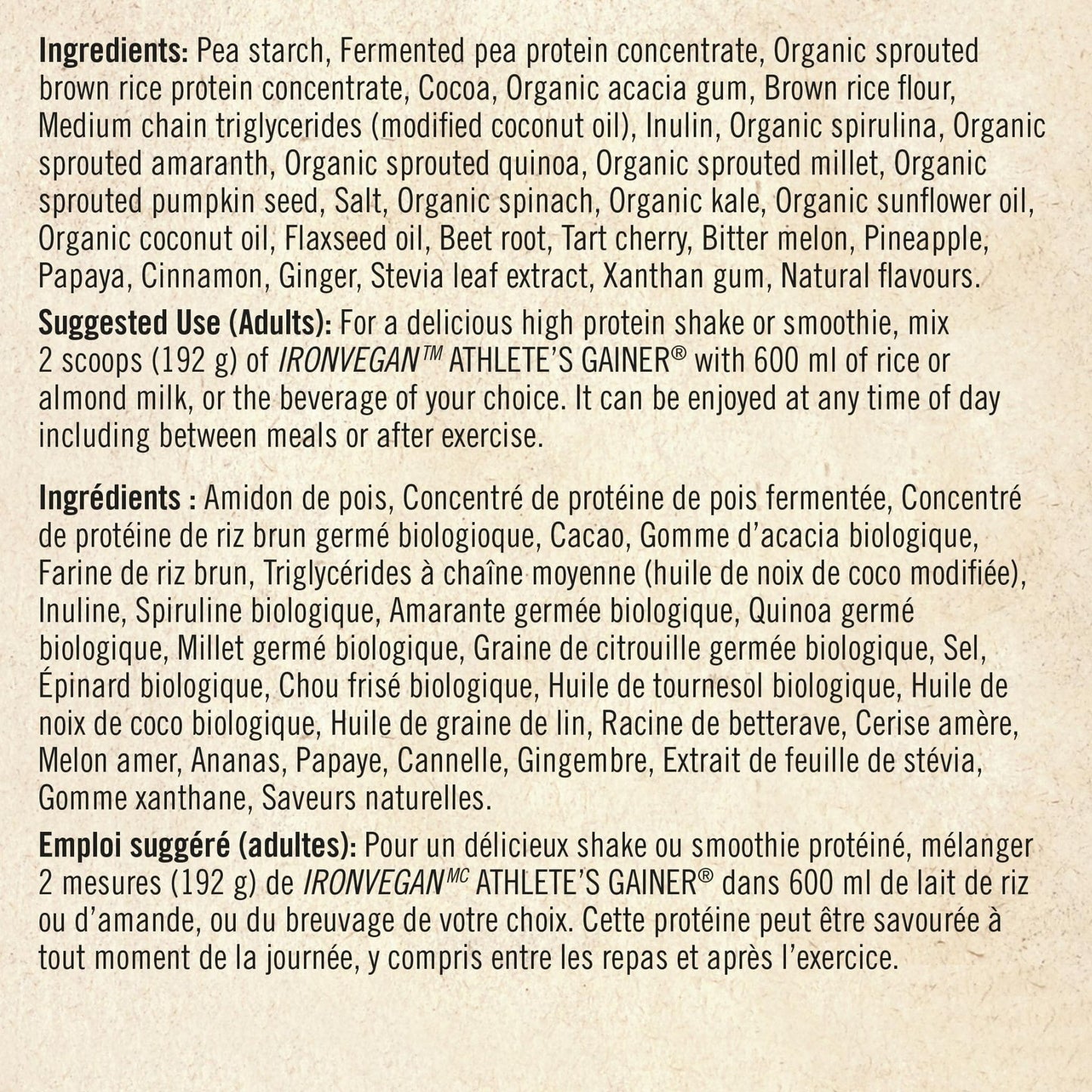 For a delicious high protein shake or smoothie, mix 2 scoops (190 g) of IRONVEGAN ATHLETE’S GAINERTM with 600 ml of rice or almond milk, or the beverage of your choice. It can be enjoyed at any time of day including between meals or after exercise.