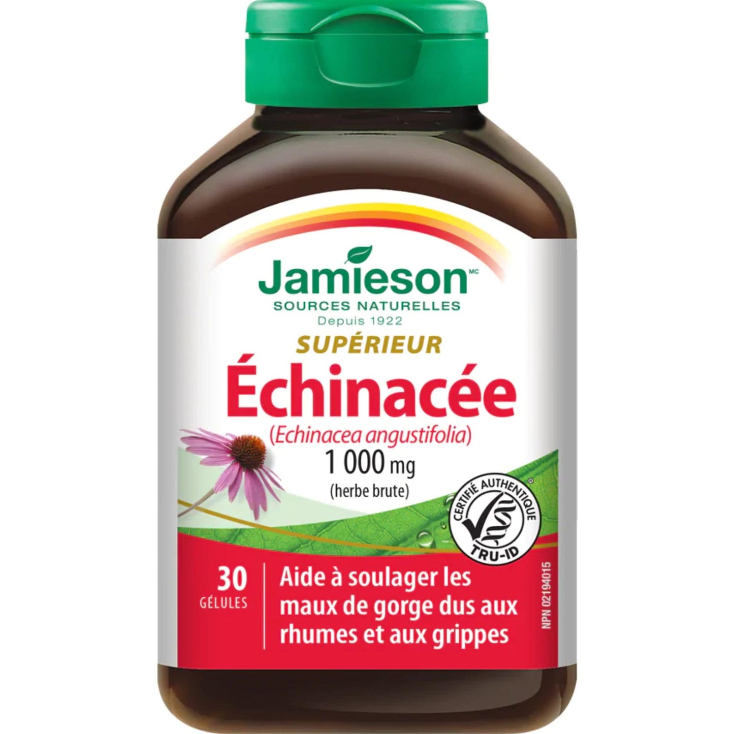 Jamieson Echinacea 1,000 mg is a premium formula of pure Echinacea angustifolia. Echinacea has been used traditionally in herbal medicine to fight off upper respiratory tract infections and to relieve cold symptoms and sore throats.