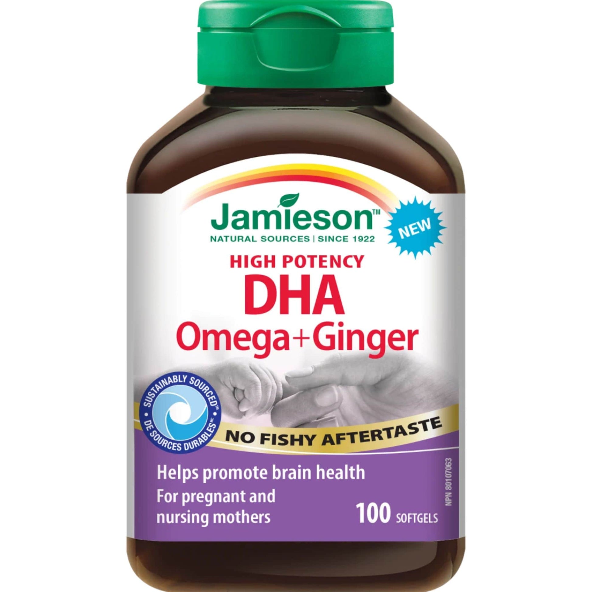 Jamieson High Potency Prenatal DHA Omega-3 + Ginger, No Fishy Aftertaste, 100 Softgels
