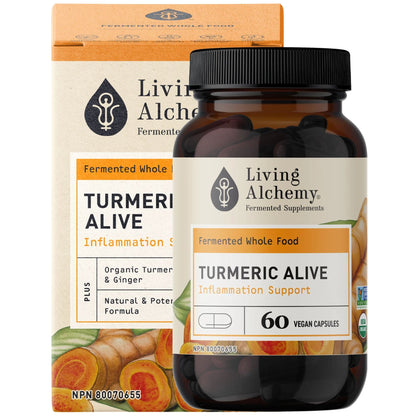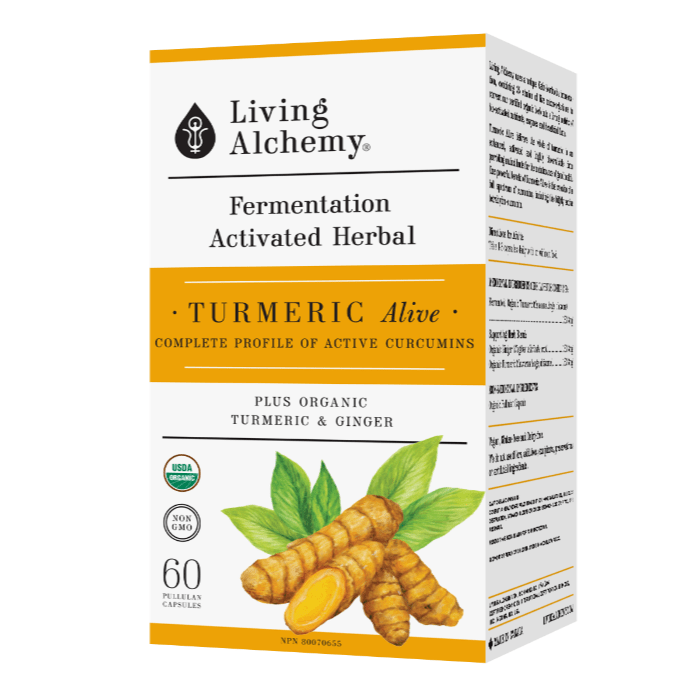 Living Alchemy Turmeric Alive is much more than just curcumin. In its whole form, turmeric provides many nutrients our bodies can use to help nourish and balance itself particularly when it comes to inflammation and oxidation. When we long ferment organic turmeric using our 35 strain Kefir-kombucha culture, the synergistic nutrients transform into something even more powerful. One type of compound created through our fermentation is tetrahydro-curcumin, which we call “white gold.” About 1000% more tetrahydro-curcumin is found in our fermented turmeric compared to non-fermented turmeric. This highly active compound has been shown to have complementary actions to other curcumins within whole turmeric especially for anti-inflammatory and anti-oxidant action. Our unique fermentation creates a bio-available form of activated whole turmeric that becomes water soluble and more nutrient dense. No black pepper. No nano particles. Its fermented whole food after all – nothing needs to be added. Only in its natural, whole, fermented state can Turmeric provide the fully activated synergy of nature. USDA Certified Organic, Non-GMO, 100% Natural Whole Food Supplement Fermented, whole herb - no isolates .Vegan, Gluten and Dairy Free .Made in Canada .Free from excipients, binders, additives, and any artificial ingredients or chemicals