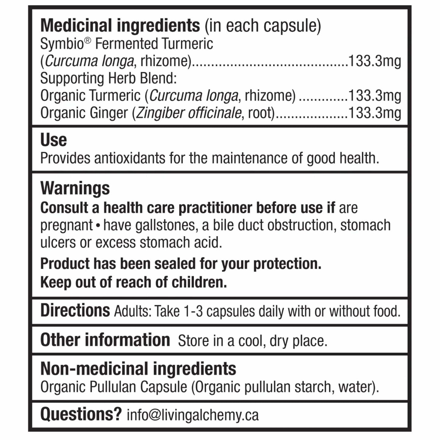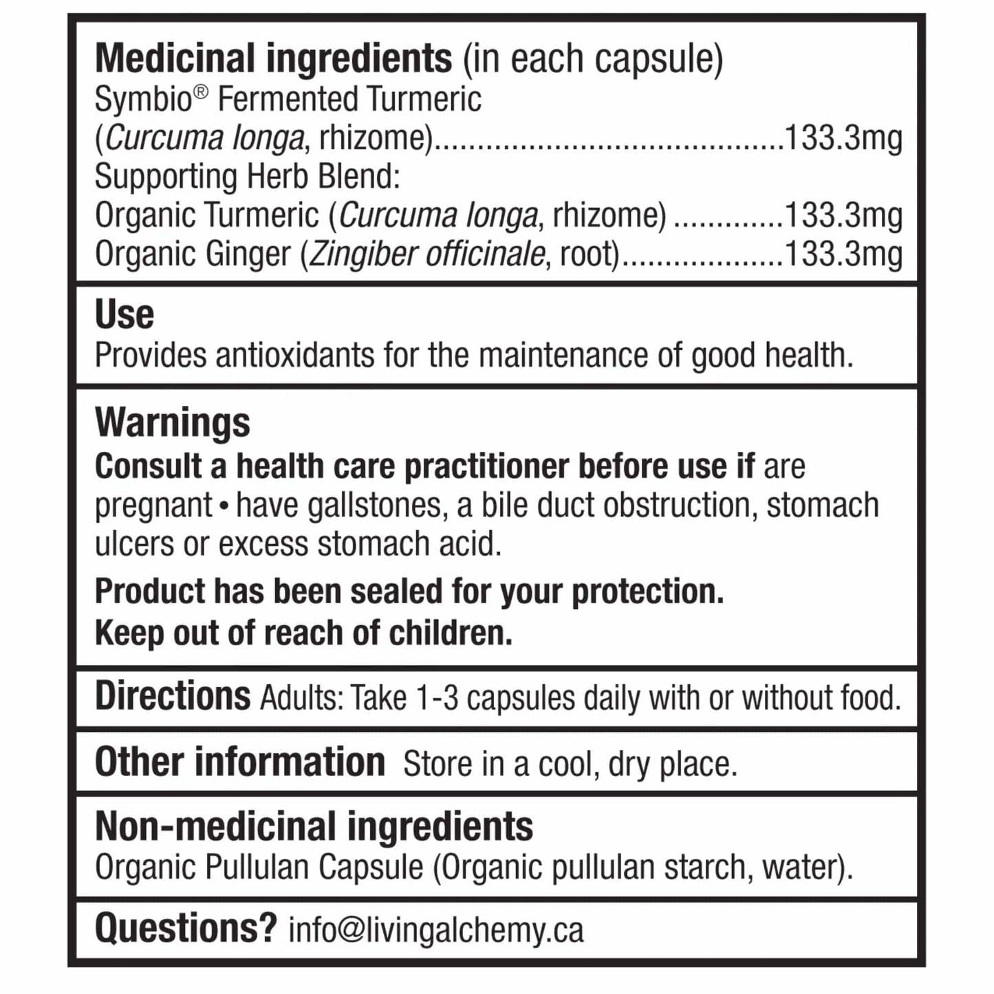 Each capsule contains: Medicinal Ingredients: Fermented, Organic Turmeric 133.3mg (Curcuma longa, rhizome) Supporting Herb Blend: Organic Ginger 133.3mg (Zingiber officinale, root), Organic Turmeric 133.3mg (Curcuma longa, rhizome) Non-medicinal Ingredients: Organic Pullulan Capsule