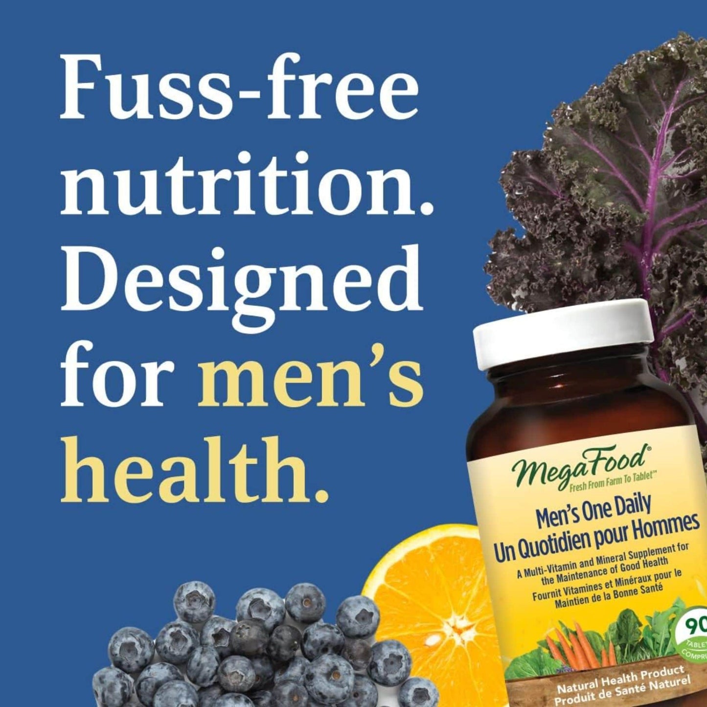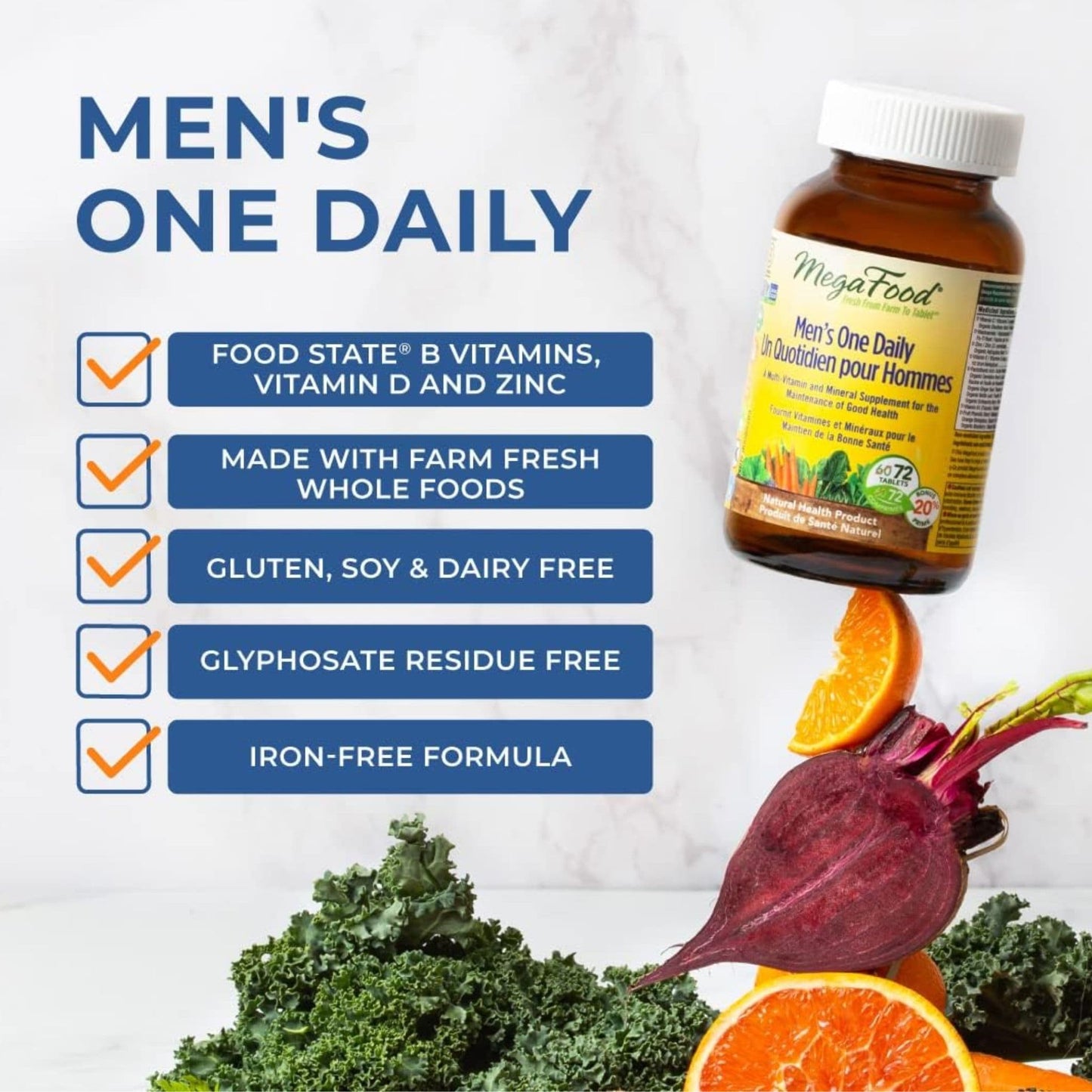 MegaFoods DailyFoods Men's One Daily Iron Free Multivitamin supports energy levels & healthy stress response. It is a convenient one daily formula. MegaFood DailyFoods Men's One Daily provides 100% whole food nutrients and energizing organic herbs for life. MegaFood DailyFoods Men's One Daily contains a body strengthening herbal blend that provides a range of organic botanicals including ginger root, Fo-Ti and nettle leaf to support the health of the whole body.