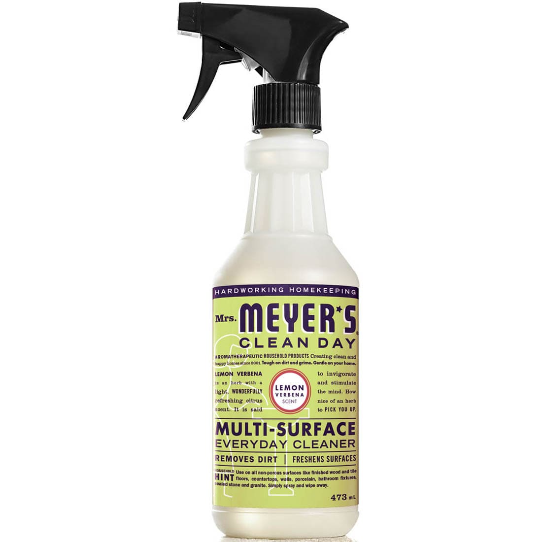 Mrs. Meyer's Clean Day Lemon Verbena Multi-Surface Everyday Cleaner takes the basic formula of our Multi Surface Cleaner and makes it quick and easy to use in a spray bottle. We combine garden inspired scents, essential oils, and plant-derived cleaning ingredients to clean kitchen messes and all over the house. Great on all non-porous surfaces such as finished wood and tile floors, countertops, walls, porcelain, bathroom fixtures, sealed natural and synthetic stone, and more.