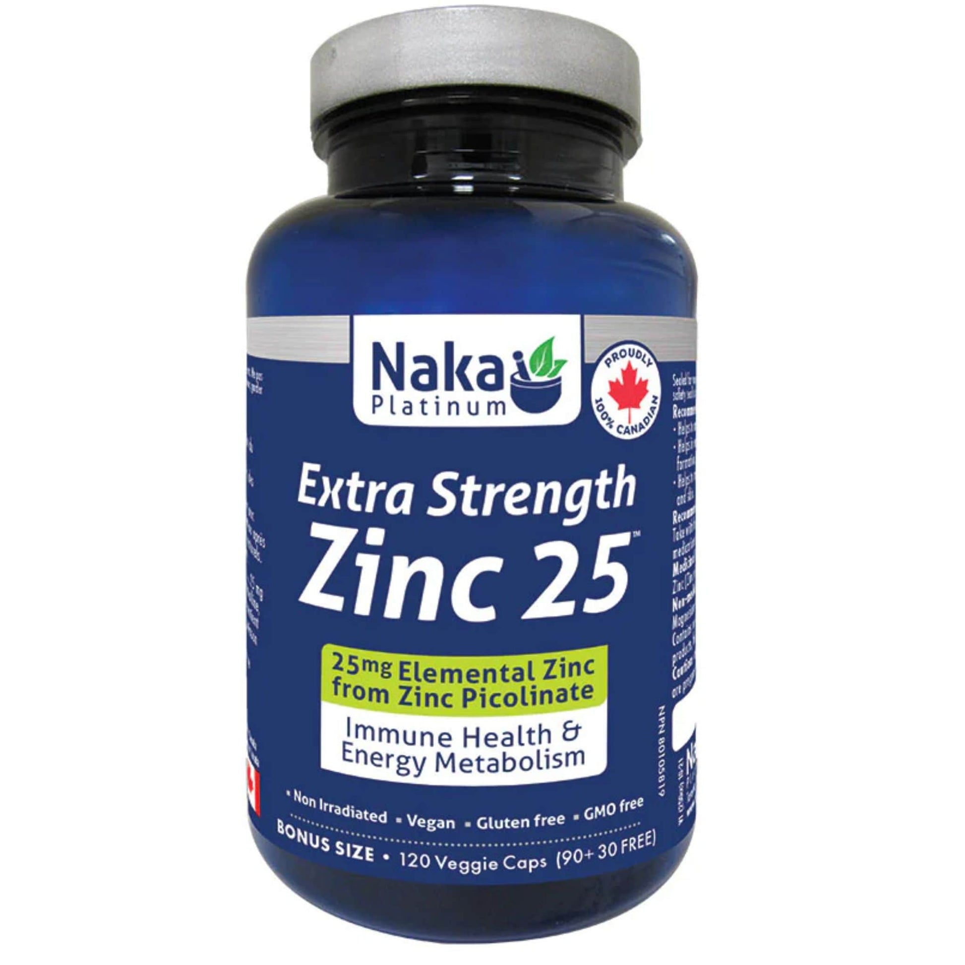 Boost your immune health and energy metabolism with Naka Platinum Extra Strength Zinc 25. Each capsule contains 25mg of highly absorbable Zinc Picolinate. Vegan and free from soy, nuts, corn, GMOs, and more.