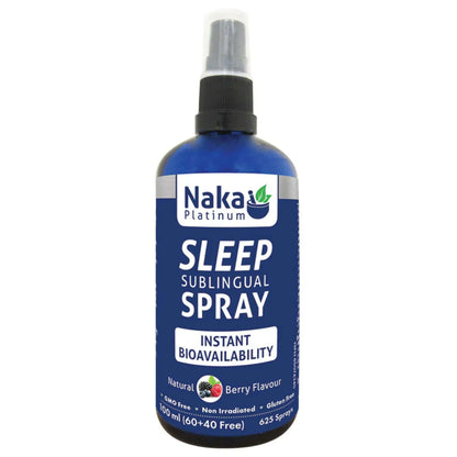 Naka Platinum Sleep Spray offers natural relaxation and relief from nervousness, aiding in better sleep. With a natural berry flavor, it's GMO-free, non-irradiated, and gluten-free, providing 5mg of melatonin per 5-spray serving.