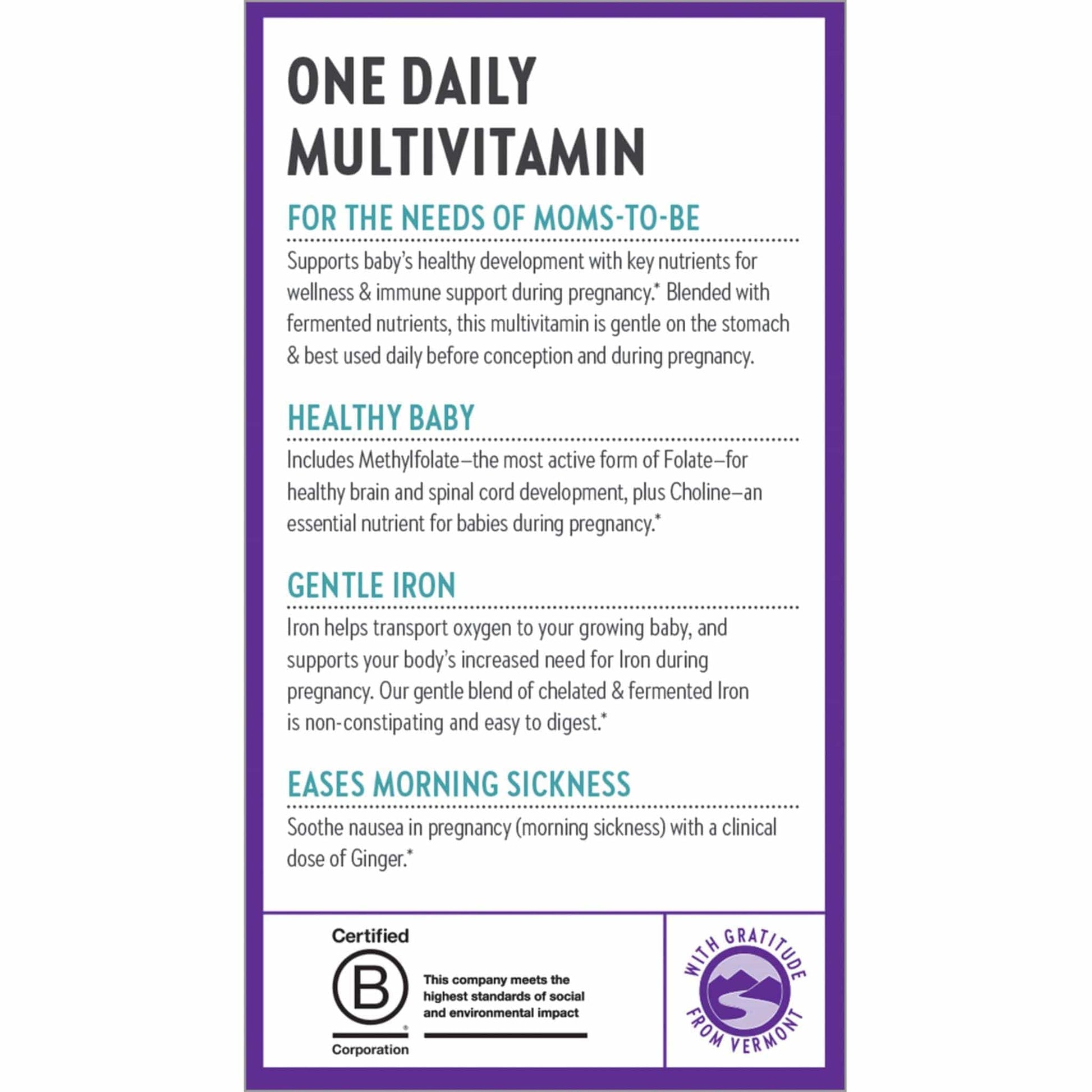 New Chapter One Daily Prenatal Multivitamin provides essential nutrients for healthy conception and pregnancy, including Methylfolate, Choline, and Ginger for nausea relief.