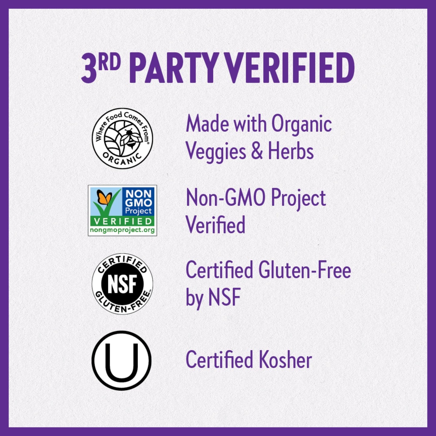 Additional Ingredients: Ferment media (organic gum acacia, organic soy flour, organic Saccharomyces cerevisiae, organic orange peel powder, lactic acid bacteria [Lactobacillus acidophilus, Bifidobacterium bifidum and Lactobacillus rhamnosus], papain [deactivated], bromelain [deactivated]), silica, capsule (pullan [Aureobasidium pullulans], carrageenan, water and potassium chloride), mixed tocopherols and organic brown rice.
