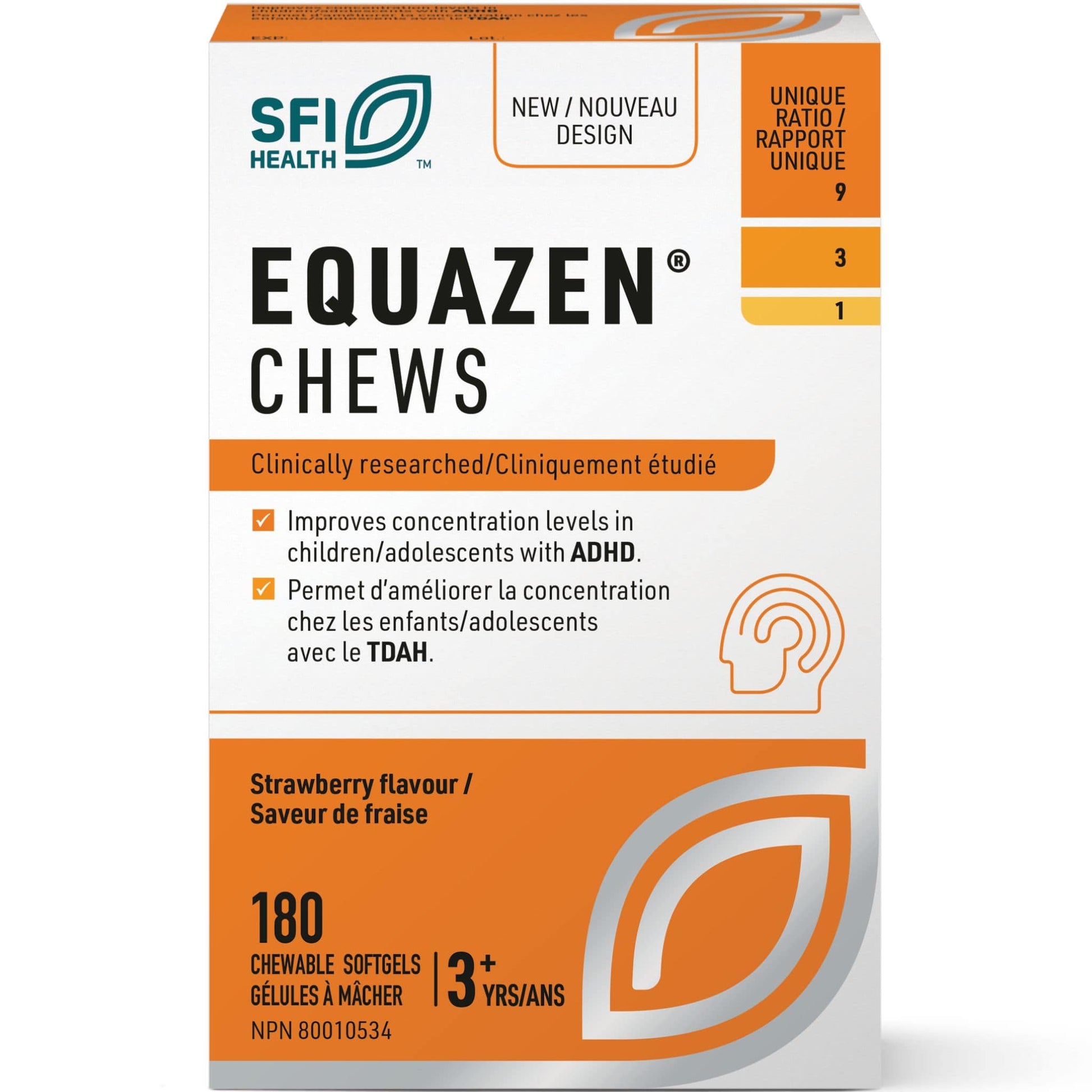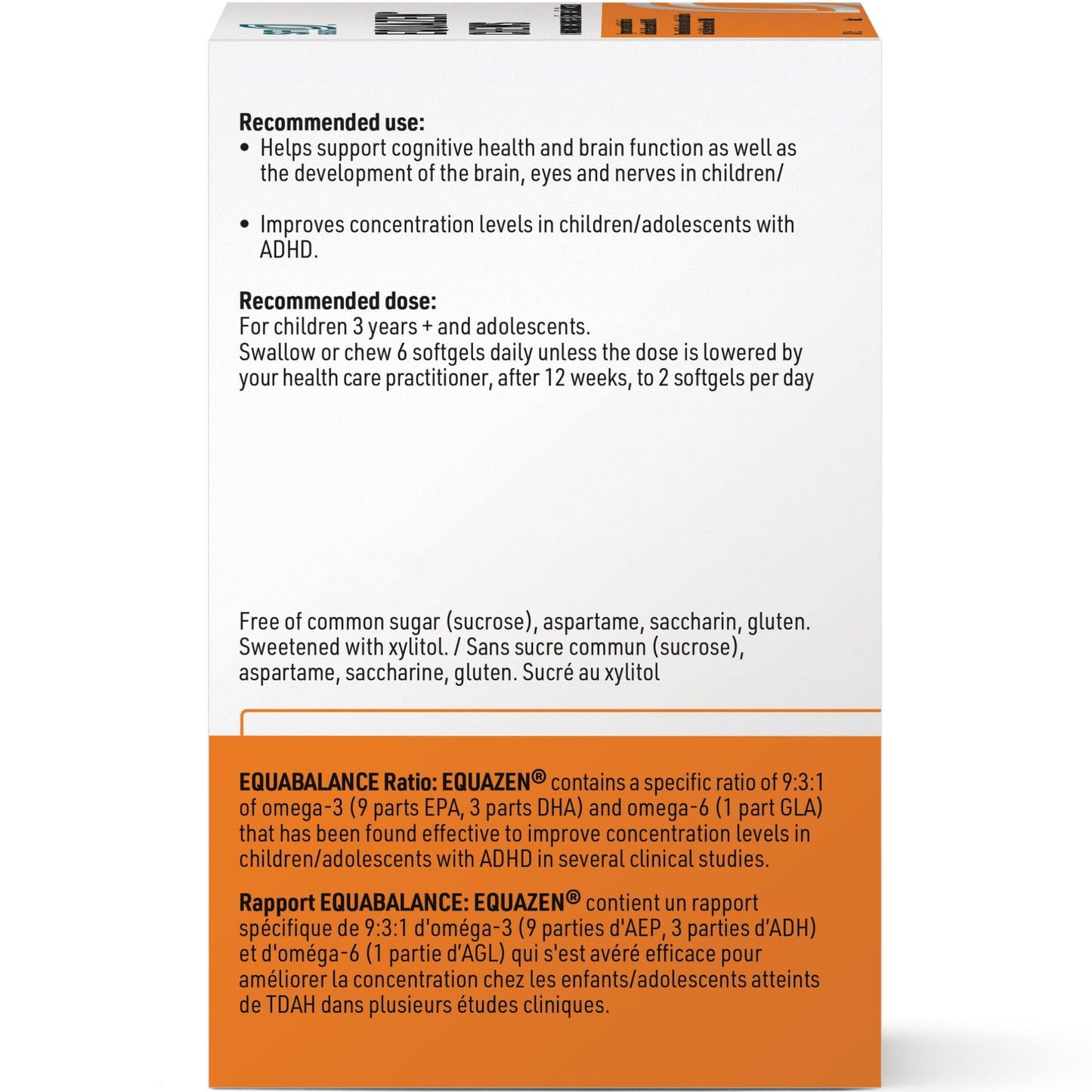 Equazen is an omega 3 and omega 6-based supplement with the unique 9:3:1 ratio of EPA, DHA and GLA. This supplement, approved by Health Canada and tested in many clinical trials, significantly improves concentration levels in children and adolescents with ADHD, and reduces other symptoms such as inattention, hyperactivity/impulsivity and learning difficulties. After 3 months of treatment children tripled their reading performance and doubled their spelling performance.