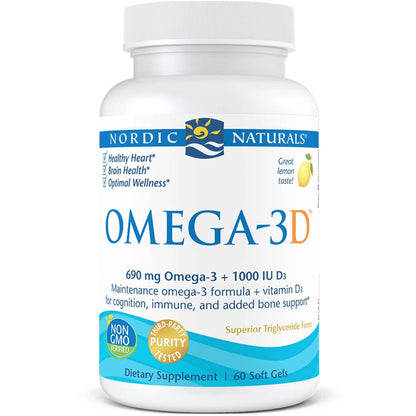 Every body needs omega-3s—and also vitamin D3—to stay healthy. Nordic Naturals' non-concentrated Omega-3D liquid and soft gels give you a convenient way to get healthy amounts of both of these essential nutrients on a daily basis.* Omega-D3 adds 1000 IU vitamin D3 (cholecalciferol), the form of vitamin D your body makes naturally from sunlight, to this formula. So you get all the health benefits of omega-3 EPA+DHA plus all the bone-building and immune-strengthening support of vitamin D, in one great-tasting serving.