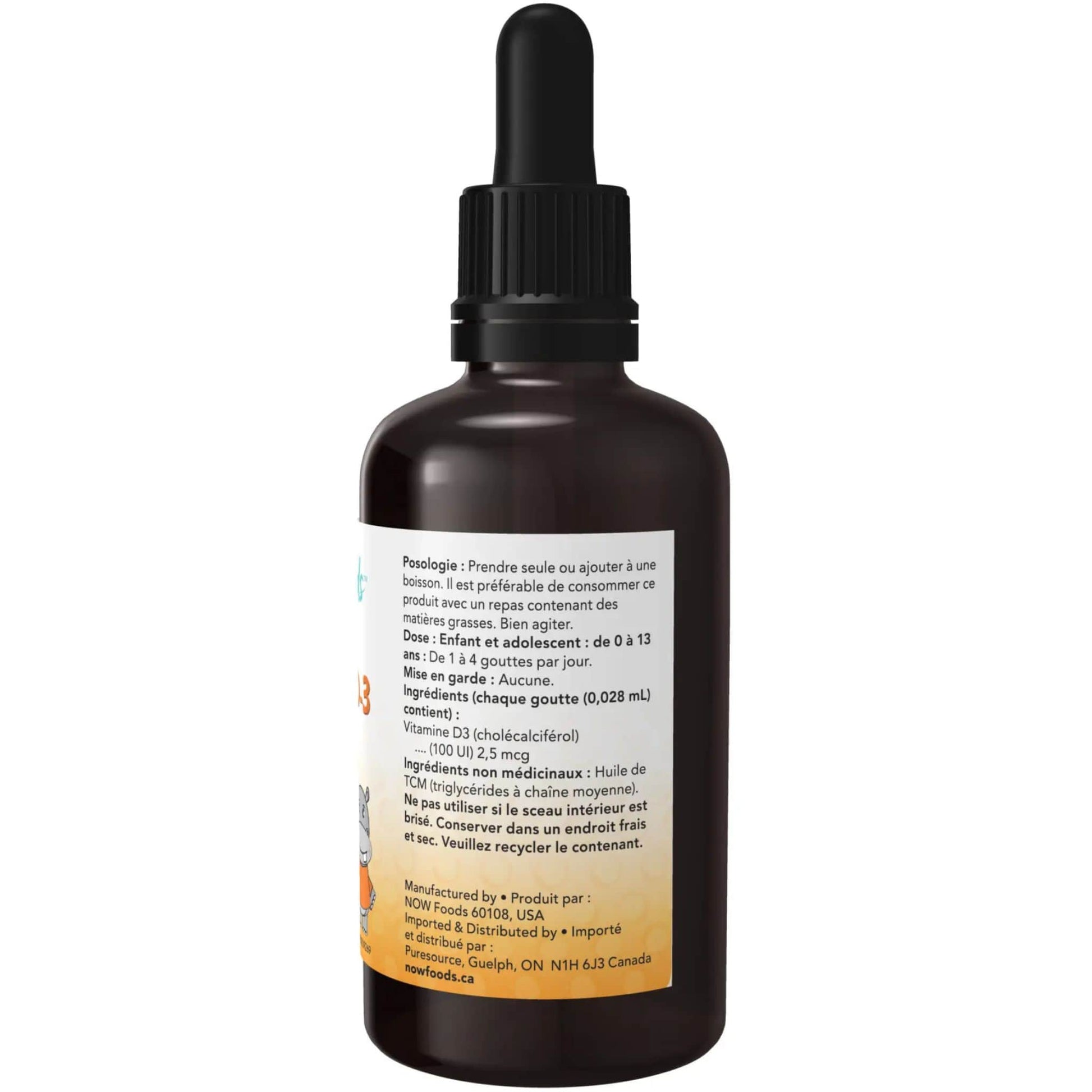 Children and Adolescents: 0-13 years: 1-4 NOW Kids Vitamin D-3 100 IU Liquid drops daily. Take directly or add to a beverage. Best taken with a fat- containing meal. Shake well.