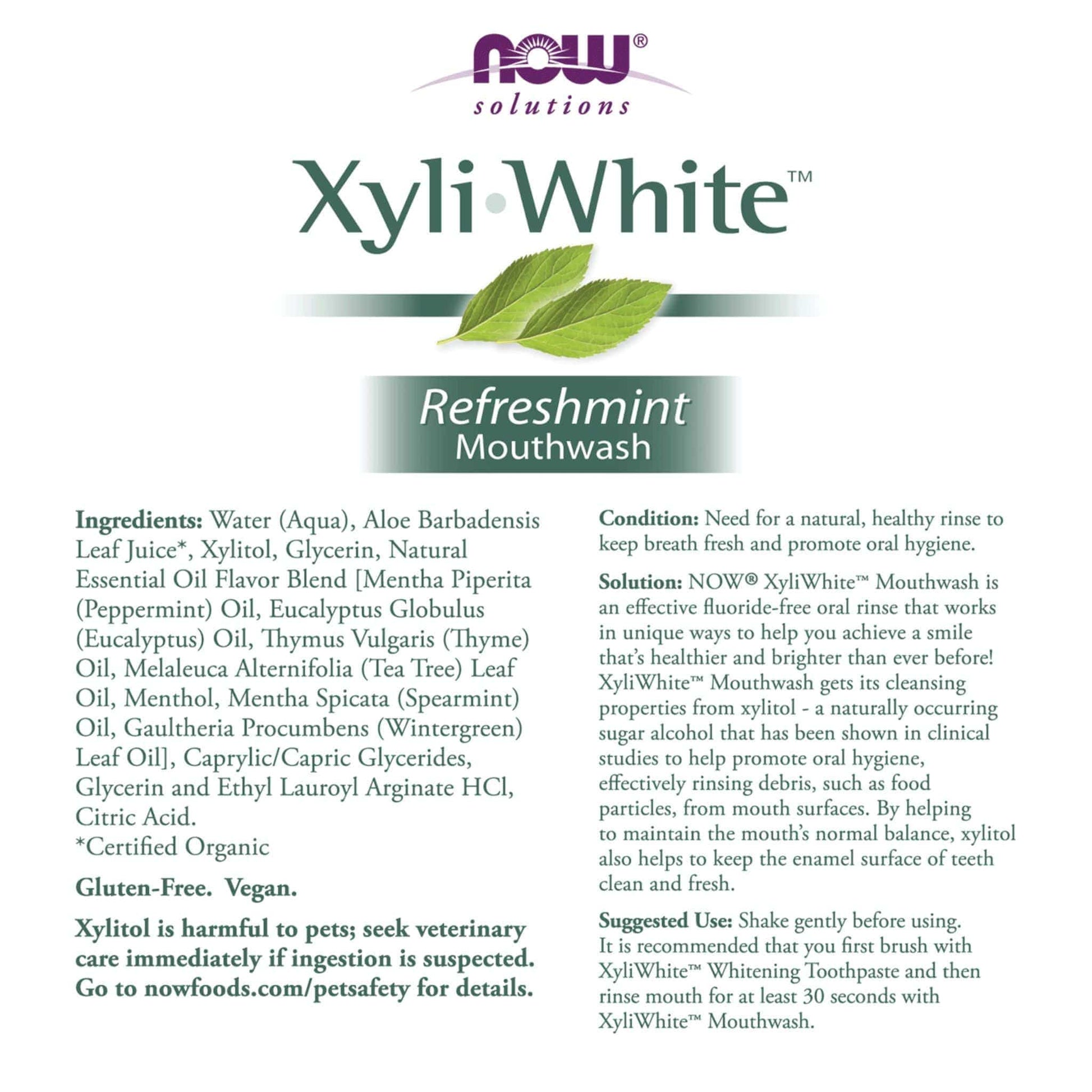 NOW® Xyliwhite™ Mouthwash is an effective fluoride-free oral rinse that works in unique ways to help you achieve a smile that's healthier and brighter than ever before! Xyliwhite™ Mouthwash gets its cleansing properties from xylitol - a naturally occurring sugar alcohol that has been shown in clinical studies to help promote dental health; effectively rinsing debris, such as food particles containing bacteria from mouth surfaces. Xylitol also helps safeguard healthy tooth enamel surfaces. By preventing the mouth's pH levels from falling below their normal range, Xyliwhite™ Mouthwash protects the enamel surface of teeth.