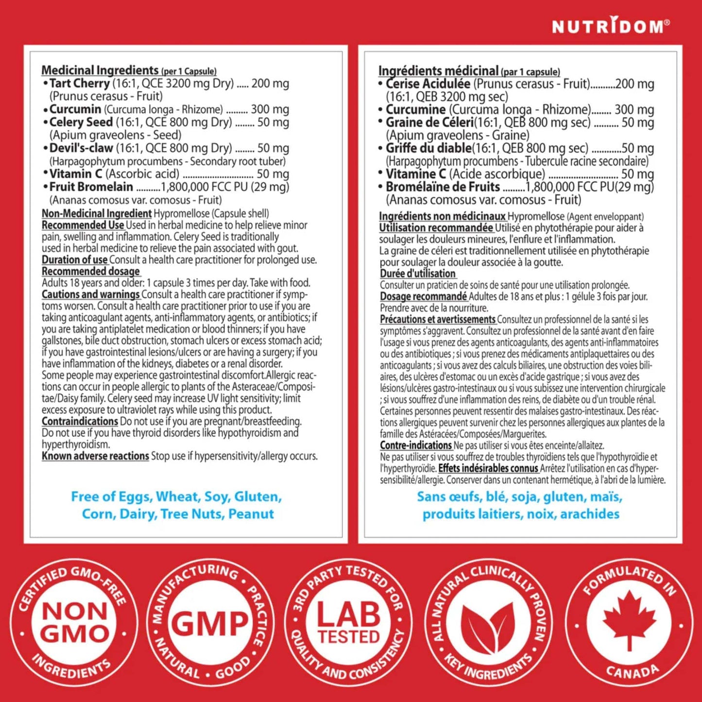 Nutridom GOUTart, Featuring Tart Cherry, Curcumin, Celery Seed, Devil's Claw, Vitamin C and Bromelain, Gout Relief and Anti-Inflammatory Support, 60 Vegetable Capsules