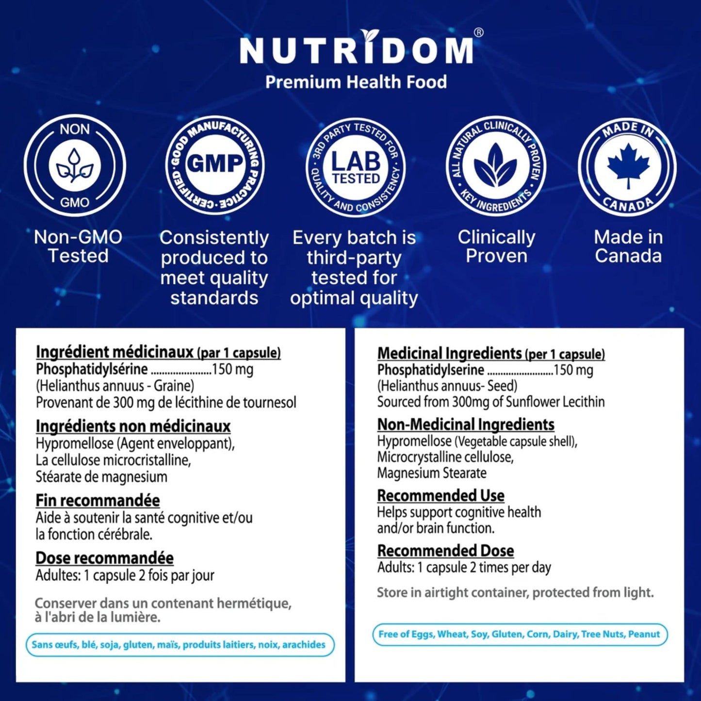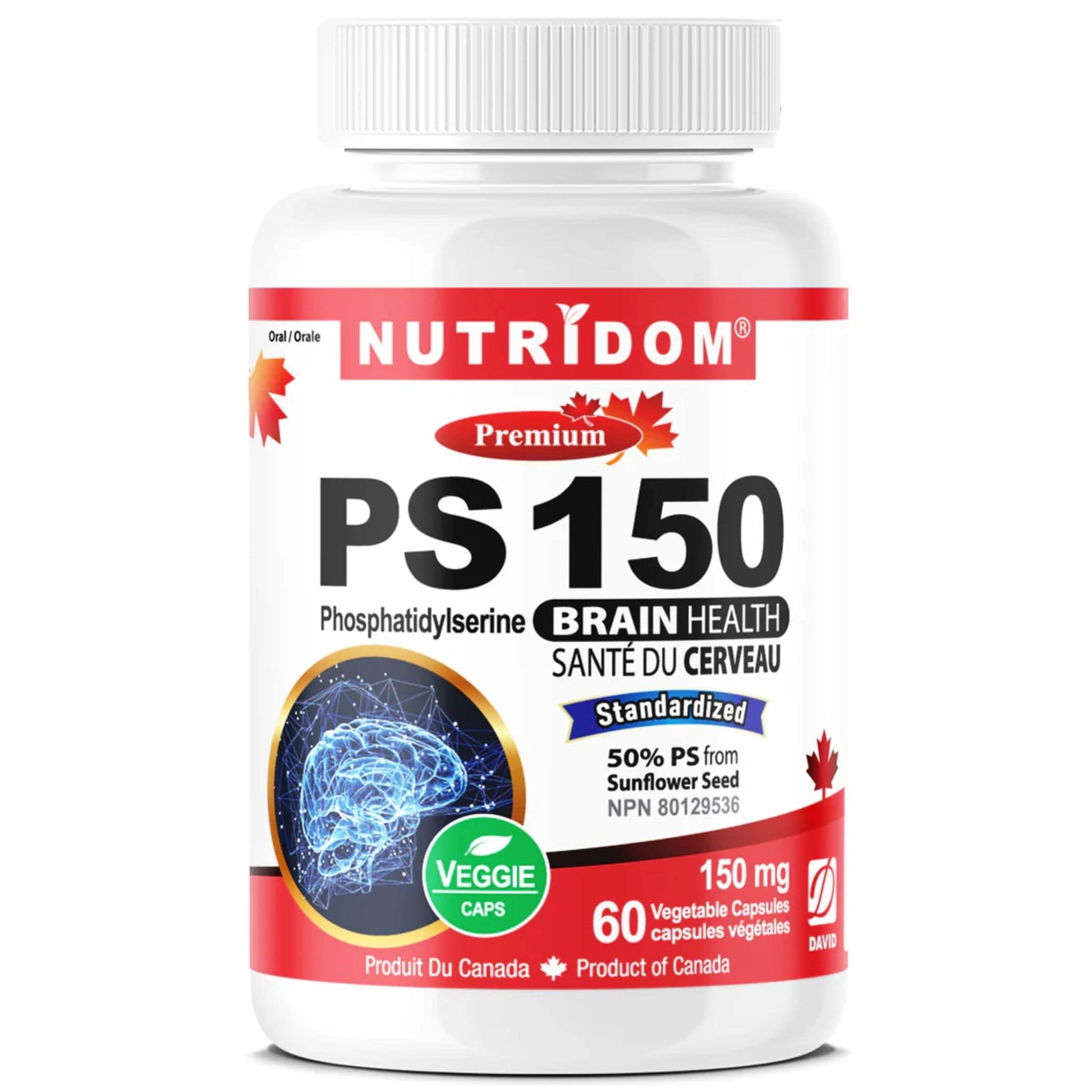 Nutridom PS 150 features a non-GMO certified sunflower seed lecithin formula, providing 50% PS (phosphatidylserine) to support cognitive health and brain function. This 100% vegan supplement is made in Canada and is free from common allergens such as gluten, soy, and dairy.