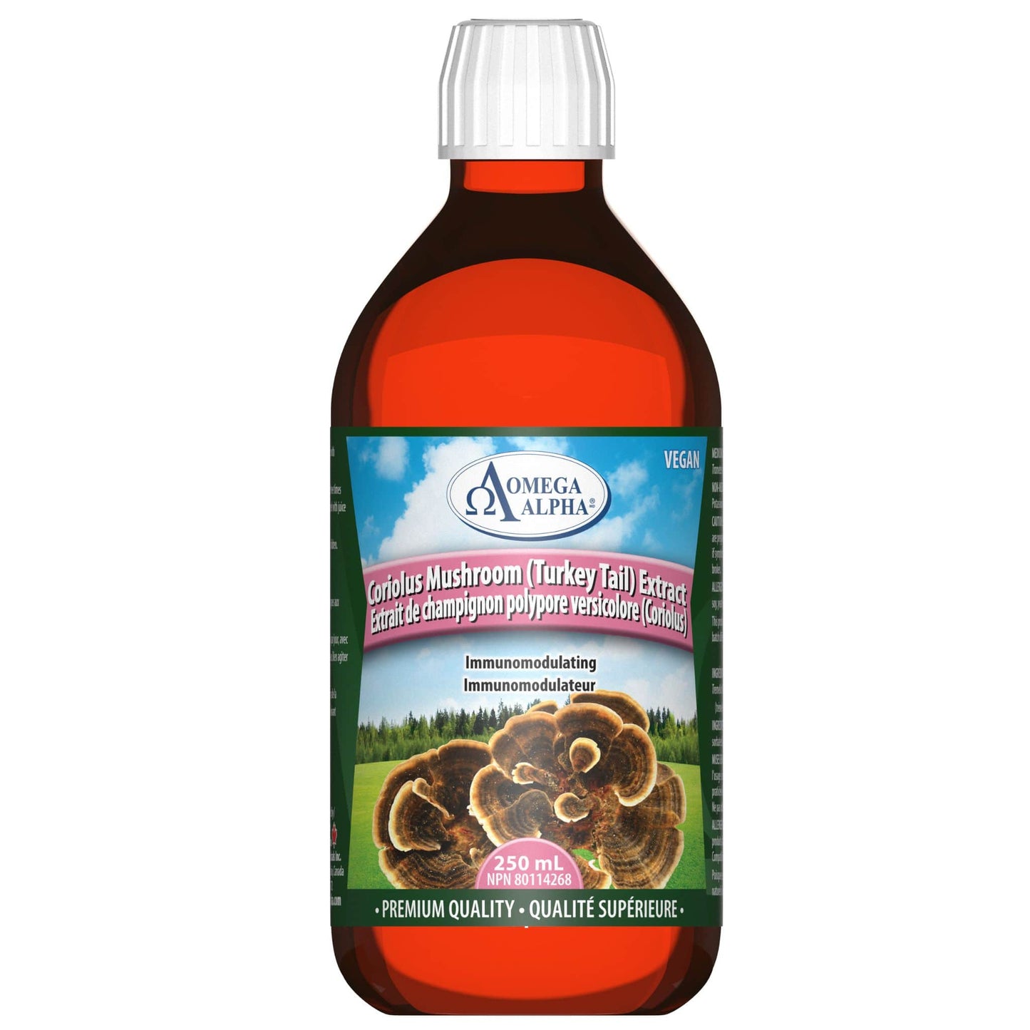 Boost your immunity with Omega Alpha Coriolus Turkey Tail Mushroom Liquid Extract—packed with 1000mg of potent immunomodulating polysaccharides in a convenient 250ml bottle.