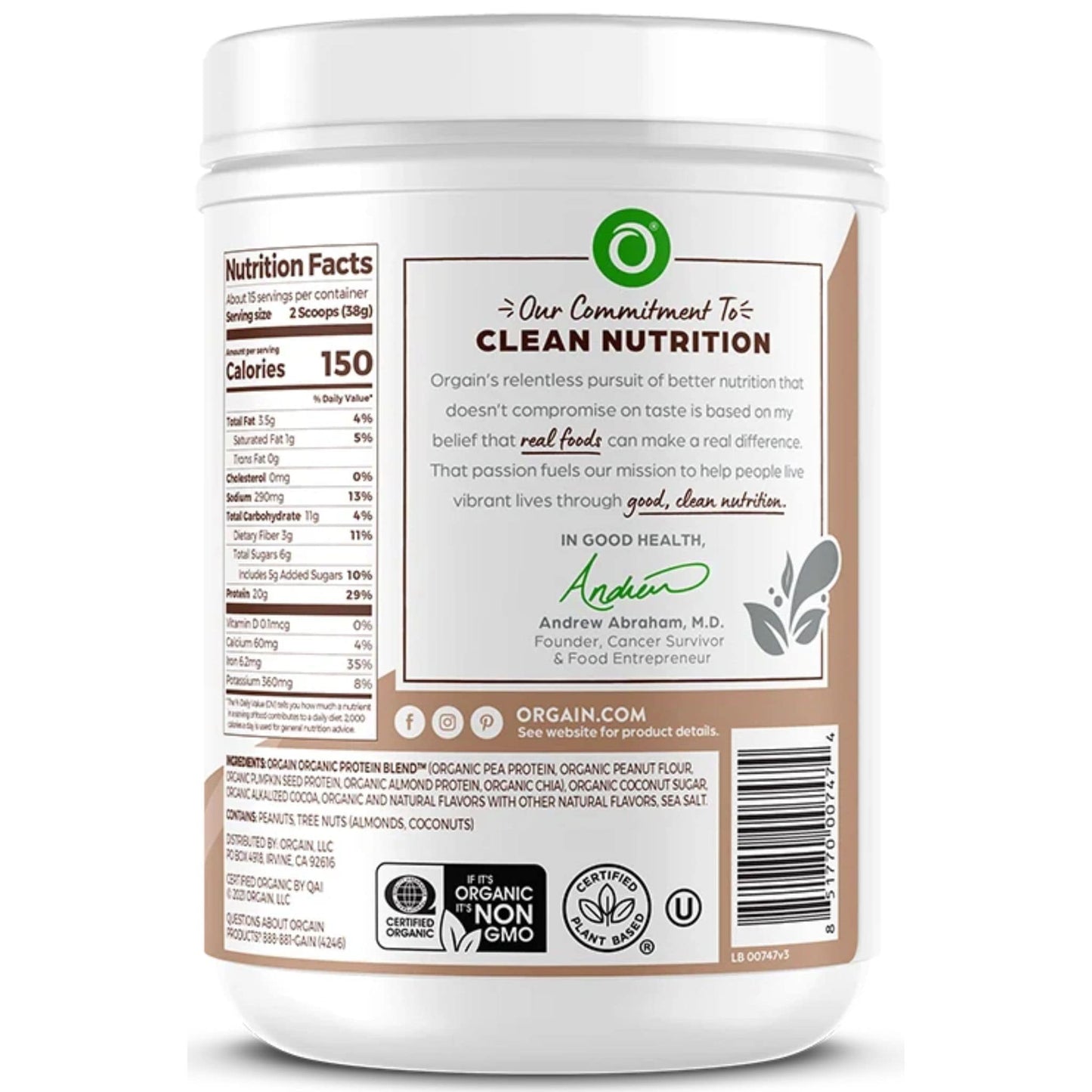 Creamy Chocolate: Orgain Organic Protein Blend™ (Organic pea protein, Organic peanut flour, Organic pumpkin seed protein, Organic almond protein, Organic chia), Organic coconut sugar, Organic alkalized cocoa, Organic and natural flavors with other natural flavors, Sea salt.
