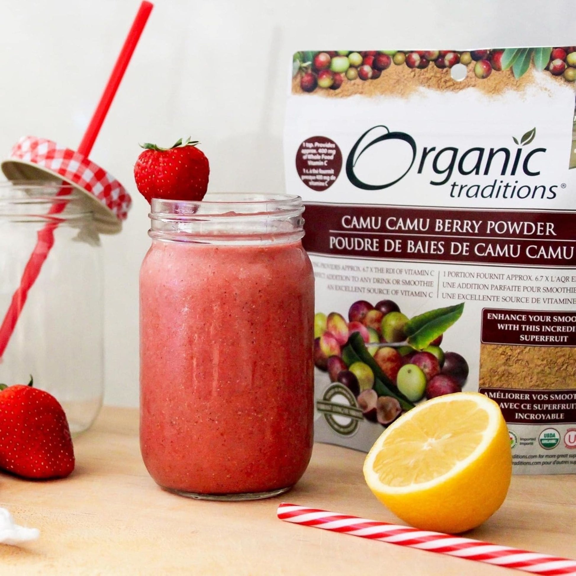 Add Organic Traditions Camu Powder to water, coconut water, your favorite juices, smoothies, raw desserts, truffles, power bars, snacks, cereals, yogurt and more. Use 1-3 teaspoons per day. Add 1 teaspoon of Camu Camu Powder to 8 oz. of plain water with 1 tsp. of Organic Traditions Yacon Gold™ Syrup to make a simple, refreshing lemonade. Add 1-3 teaspoons of Organic Traditions Camu Camu powder to your favorite smoothie recipe to create a nourishing, antioxidant rich smoothie.