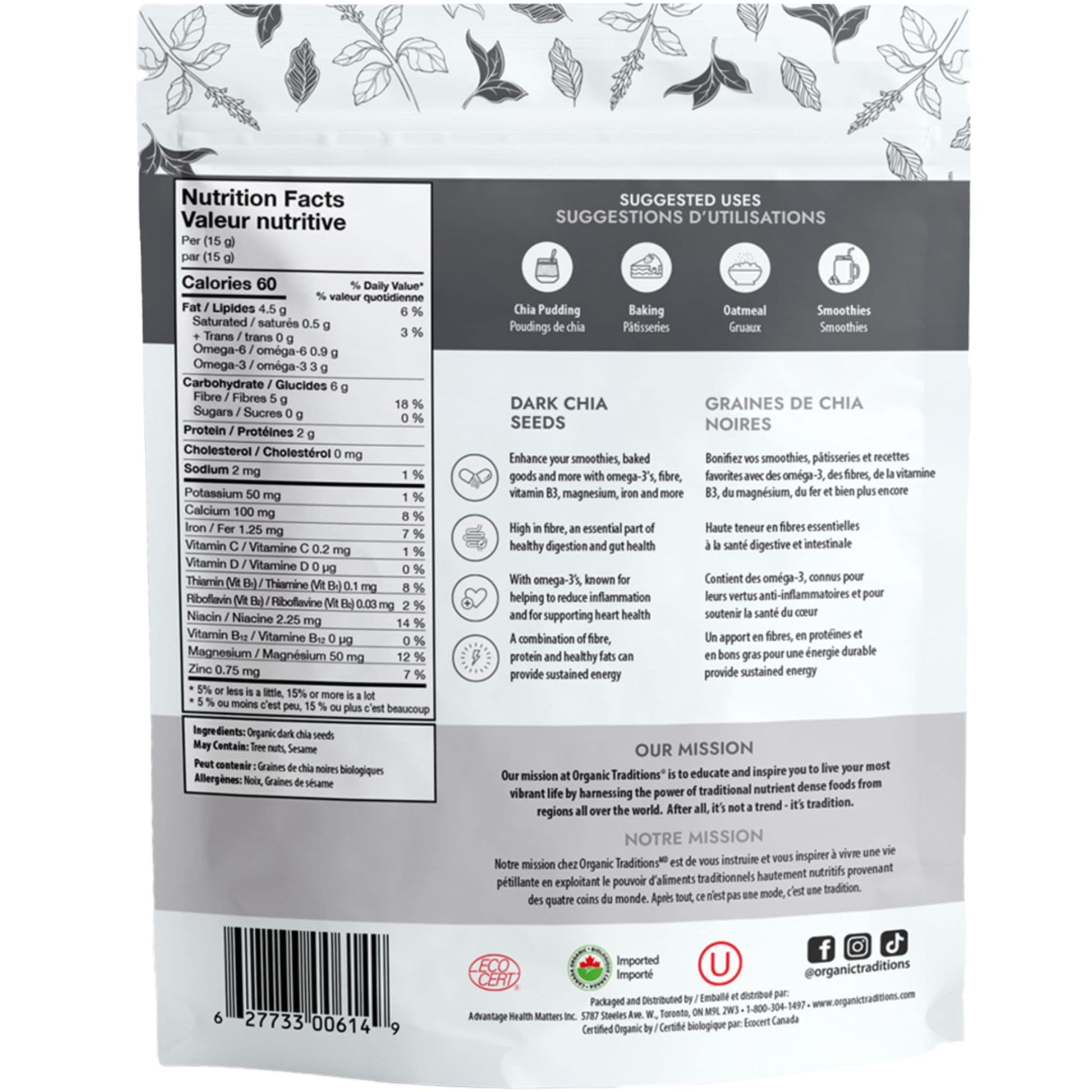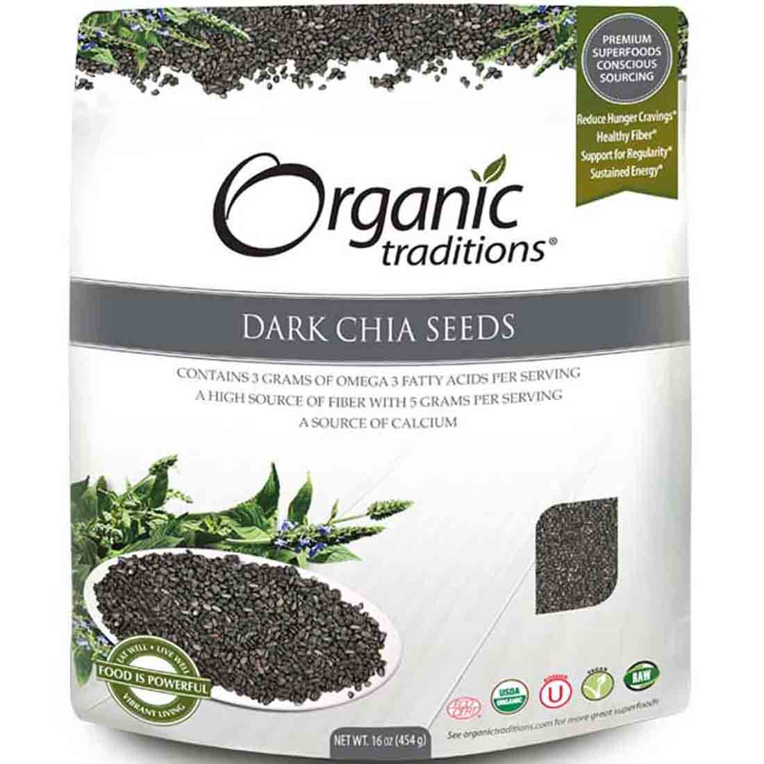 Organic Traditions Chia Seeds (Dark Whole) are superseeds packed with calcium, iron, fiber, and omega-3 fatty acids. These nutrient-dense seeds protect your heart and brain, offering protein, essential vitamins, minerals, and a host of antioxidants. Certified organic, non-GMO, kosher, and plant-based.