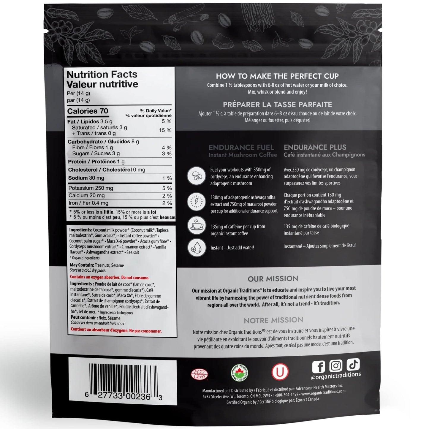 Organic Traditions Endurance Fuel is an instant mushroom coffee blend designed to supercharge your morning routine. This blend features organic instant coffee combined with energizing cordyceps, adaptogenic ashwagandha extract, and maca root powder. It provides 135mg of caffeine per cup from organic instant coffee, offering a powerful boost of energy and endurance. Made with coconut milk powder, this blend is dairy-free and easy to mix — just add water for an instant, creamy, and delicious mushroom coffee. Perfect for those seeking maximum nutrition from certified organic and natural ingredients, this coffee blend is also non-GMO and contains no added sugar.