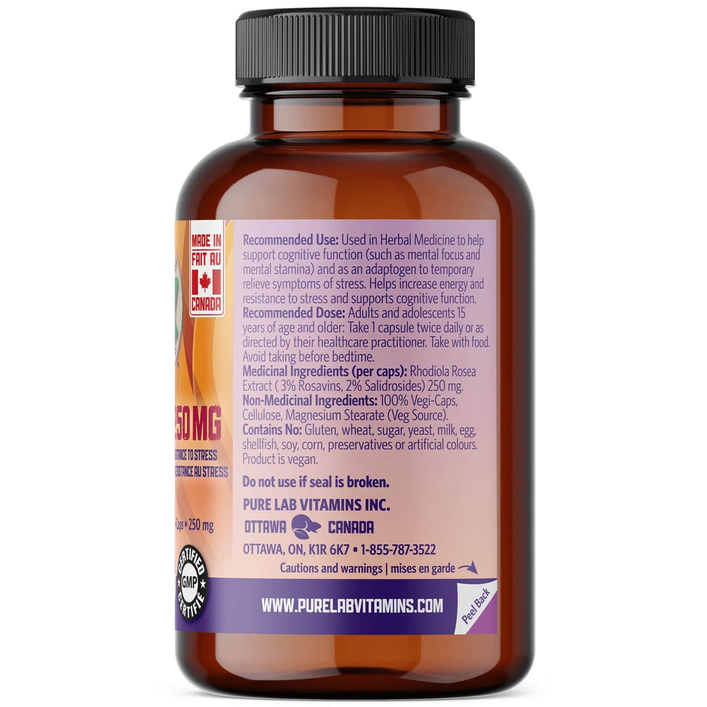 Pure Lab Vitamins Rhodiola 250mg, Supports Energy, Stamina and Stress Resistance, 60 Vegetable Capsules