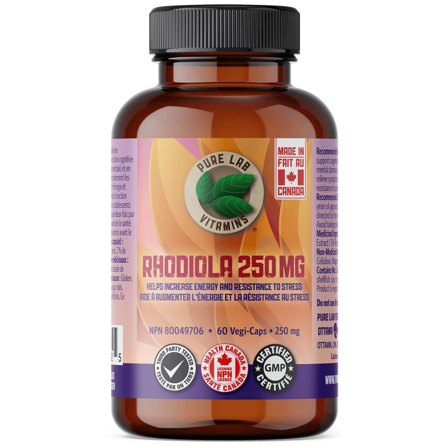 Boost your natural energy and resilience with Pure Lab Vitamins Rhodiola 250mg. This powerful adaptogen helps enhance your stamina, improve mental focus, and reduce stress, allowing you to perform better at work, in sports, and in daily life—without the jittery effects of caffeine. 100% vegan and free from gluten, soy, and artificial additives.
