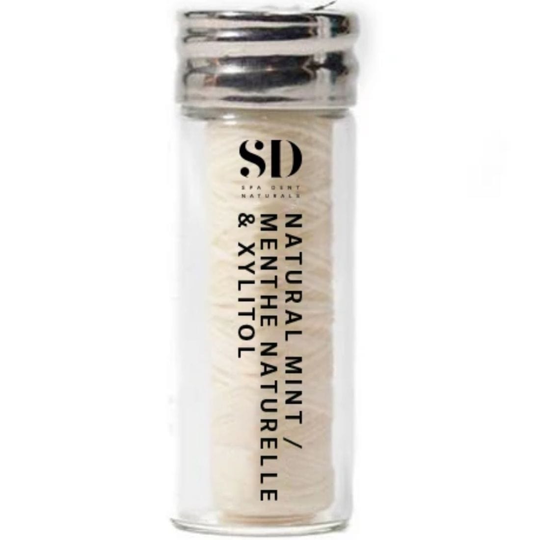 A pleasant way to floss! Spa Dent Naturals biodegradable floss is an all natural easy way to protect your oral health and the planet. Made with natural mint and xylitol for a gentle flossing experience that promotes healthy gums, cleans teeth, and freshens your mouth.