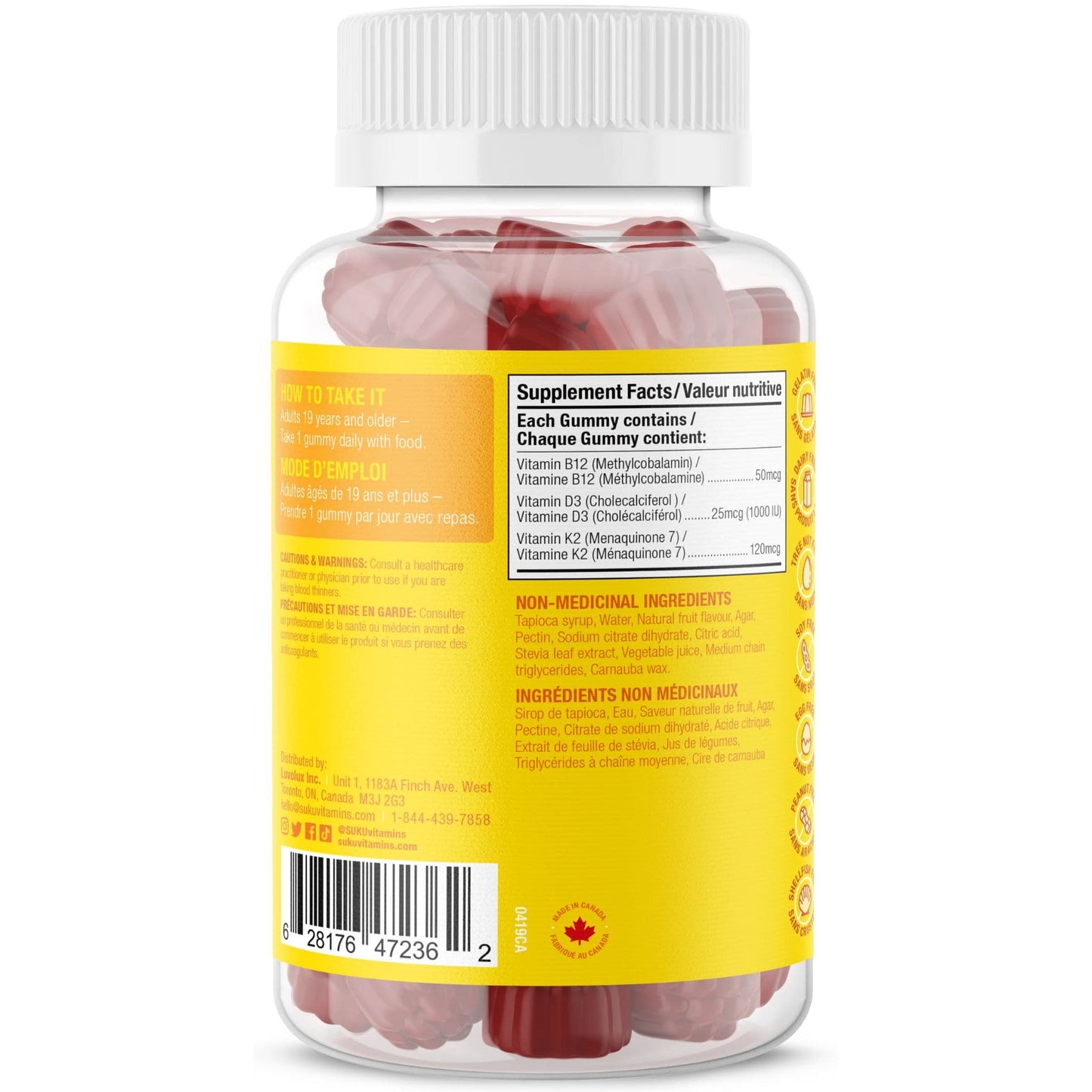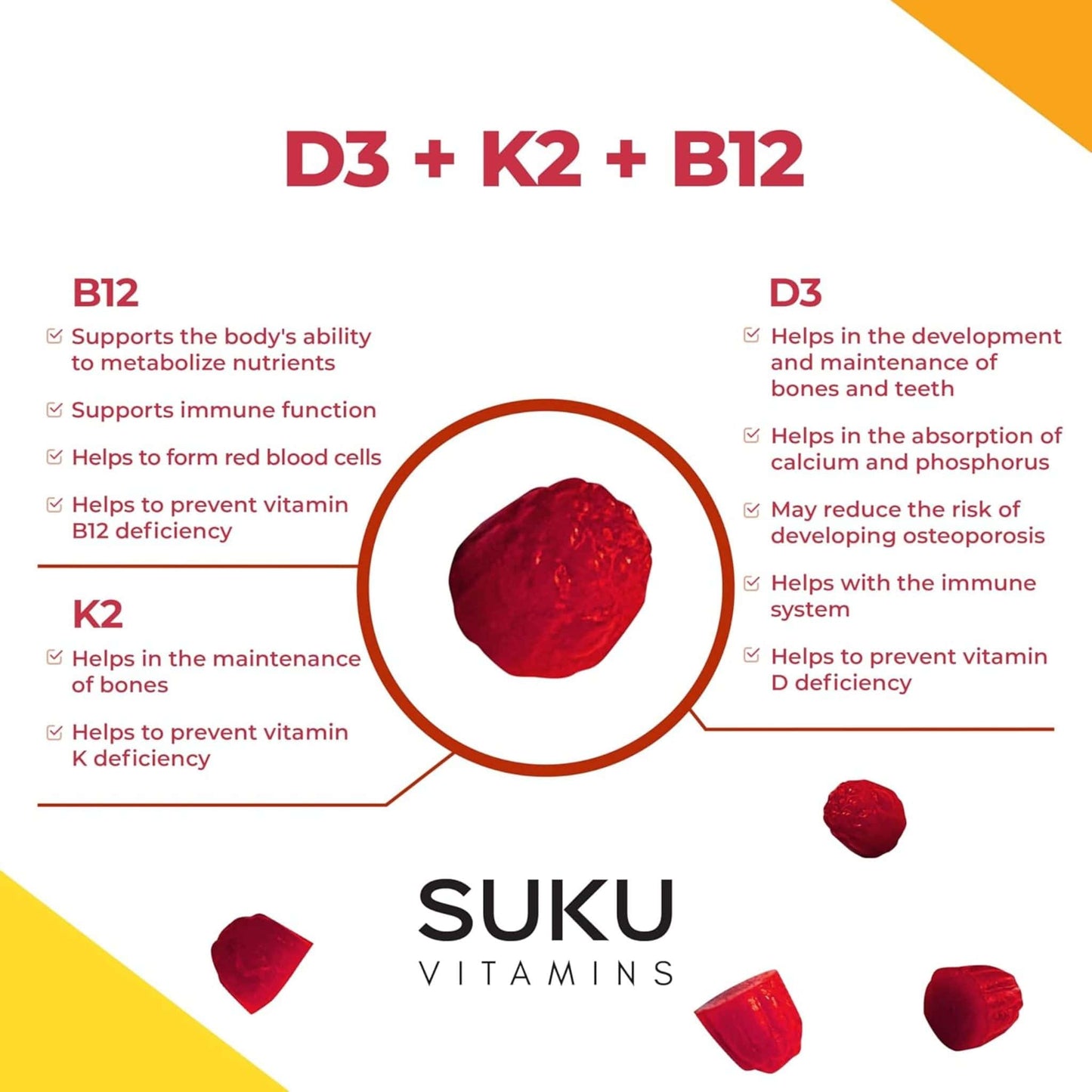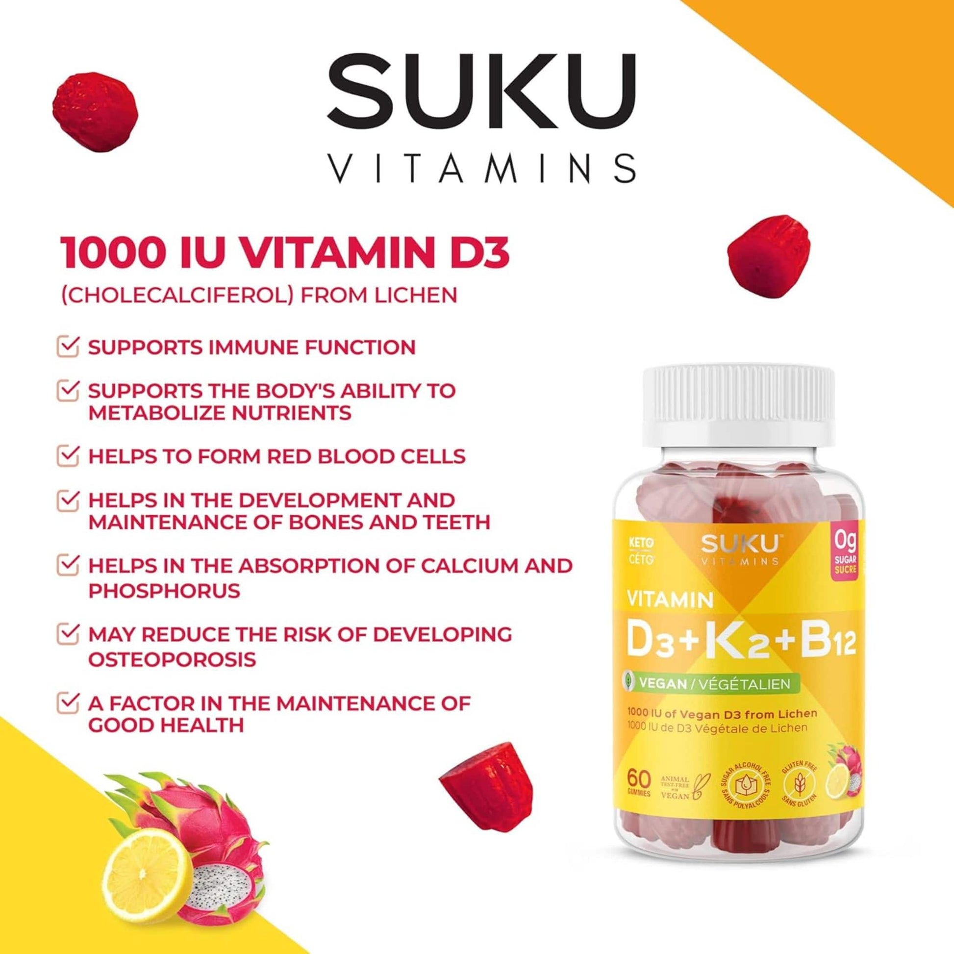 SUKU Vitamins Vitamin D3 1000 IU, K2 120 mcg, and B12 50 mcg, Supports Immune, Bone and Teeth, 60 Gummies