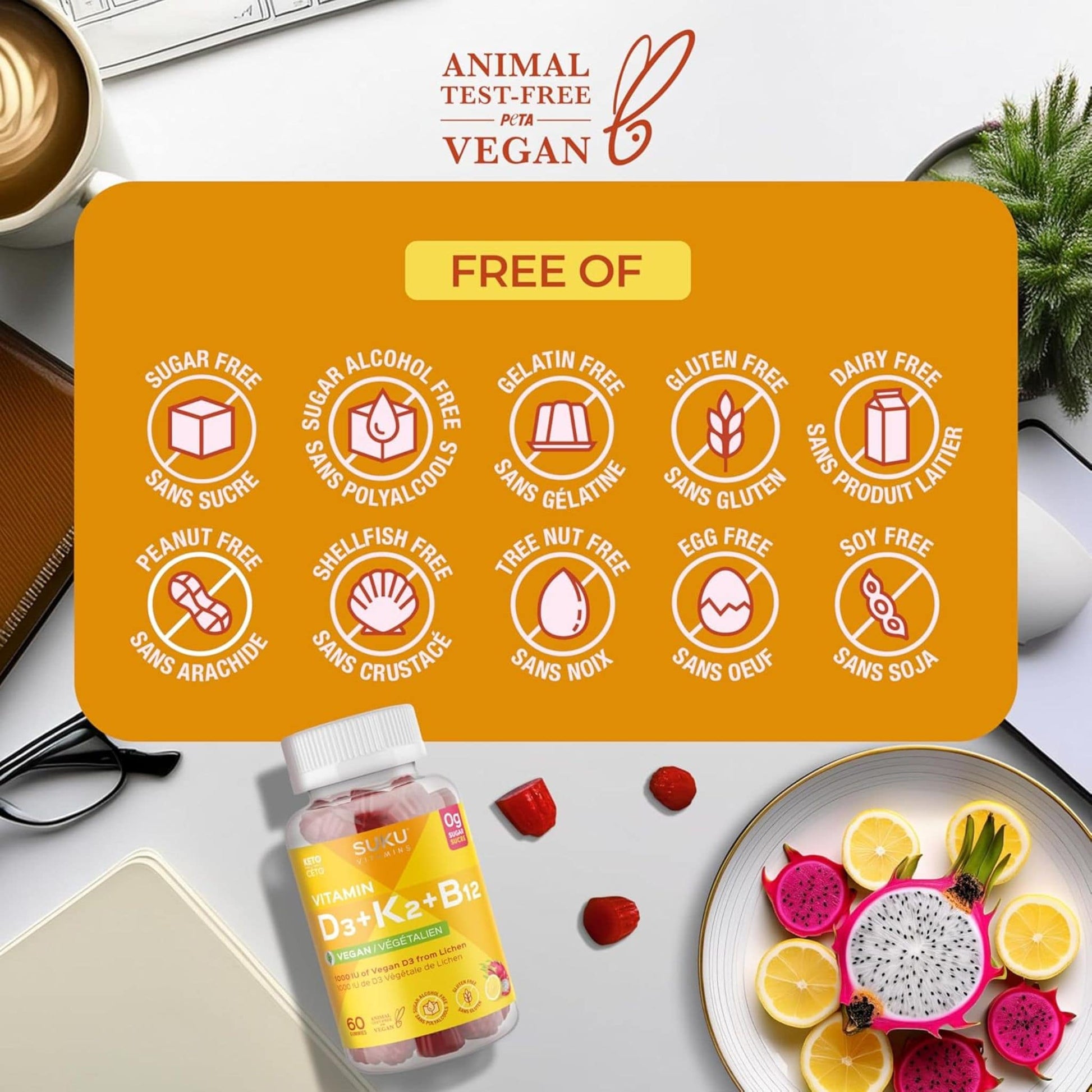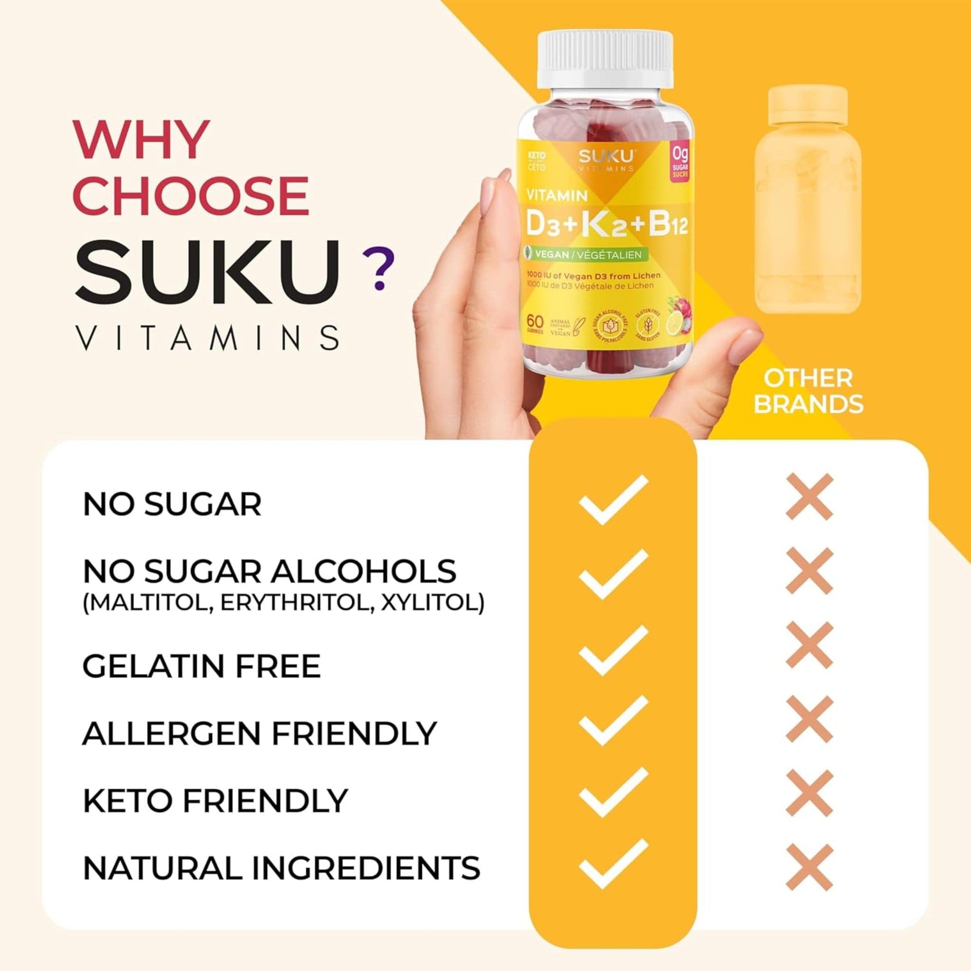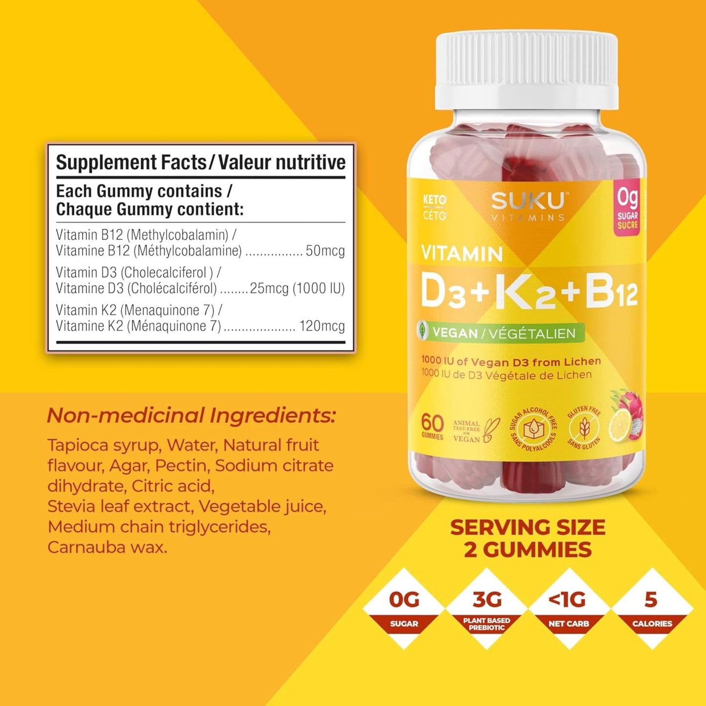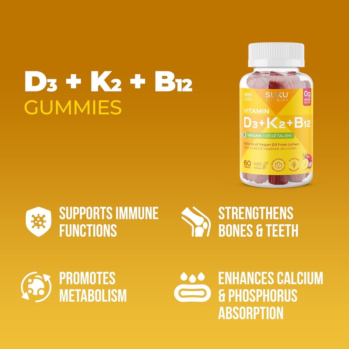 SUKU Vitamins Vitamin D3 1000 IU, K2 120 mcg, and B12 50 mcg, Supports Immune, Bone and Teeth, 60 Gummies