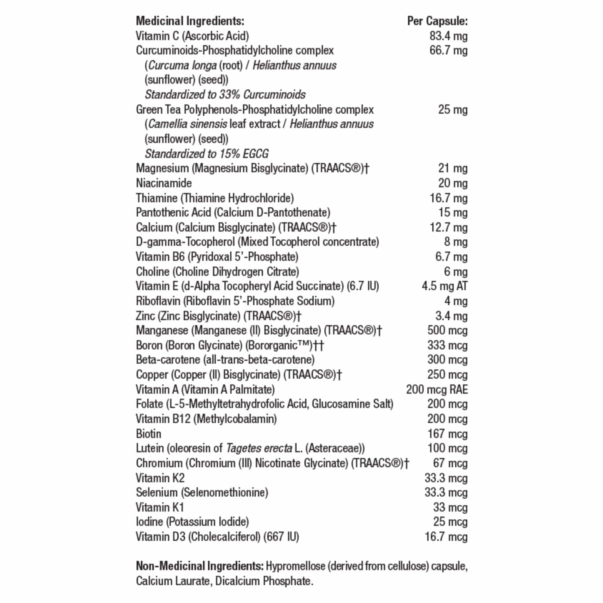 Thorne Multi-Vitamin Elite A.M. is an advanced formula designed to enhance athletic performance and energy production. Packed with essential vitamins and minerals in their most absorbable forms, this supplement supports a wide range of body functions, including bone health, immune support, and cardiovascular health. Featuring Vitamin D for strong bones, B vitamins for heart and nerve health, and Vitamins K1 and K2 for blood vessel and bone support, Multi-Vitamin Elite A.M. is perfect for active individuals looking to fuel their day. Additionally, it includes two powerful phytosomes—Meriva® for occasional joint and muscle soreness relief and green tea phytosome for enhanced fat burning and antioxidant protection.
