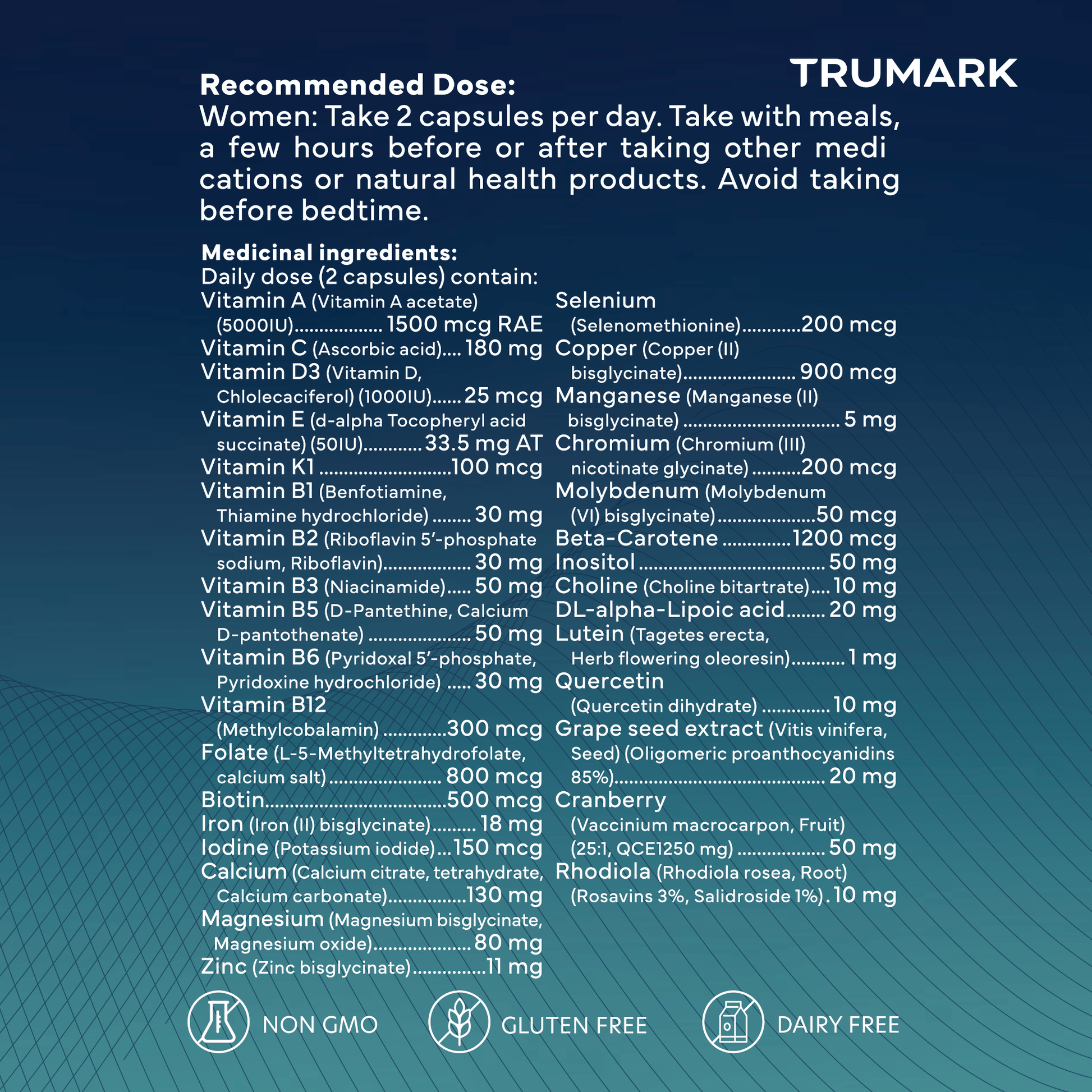 Women: Take 2 TRUMARK TRU-WOMEN capsules per day. Take with meals, a few hours before or after taking other medications or natural health products. Avoid taking before bedtime.