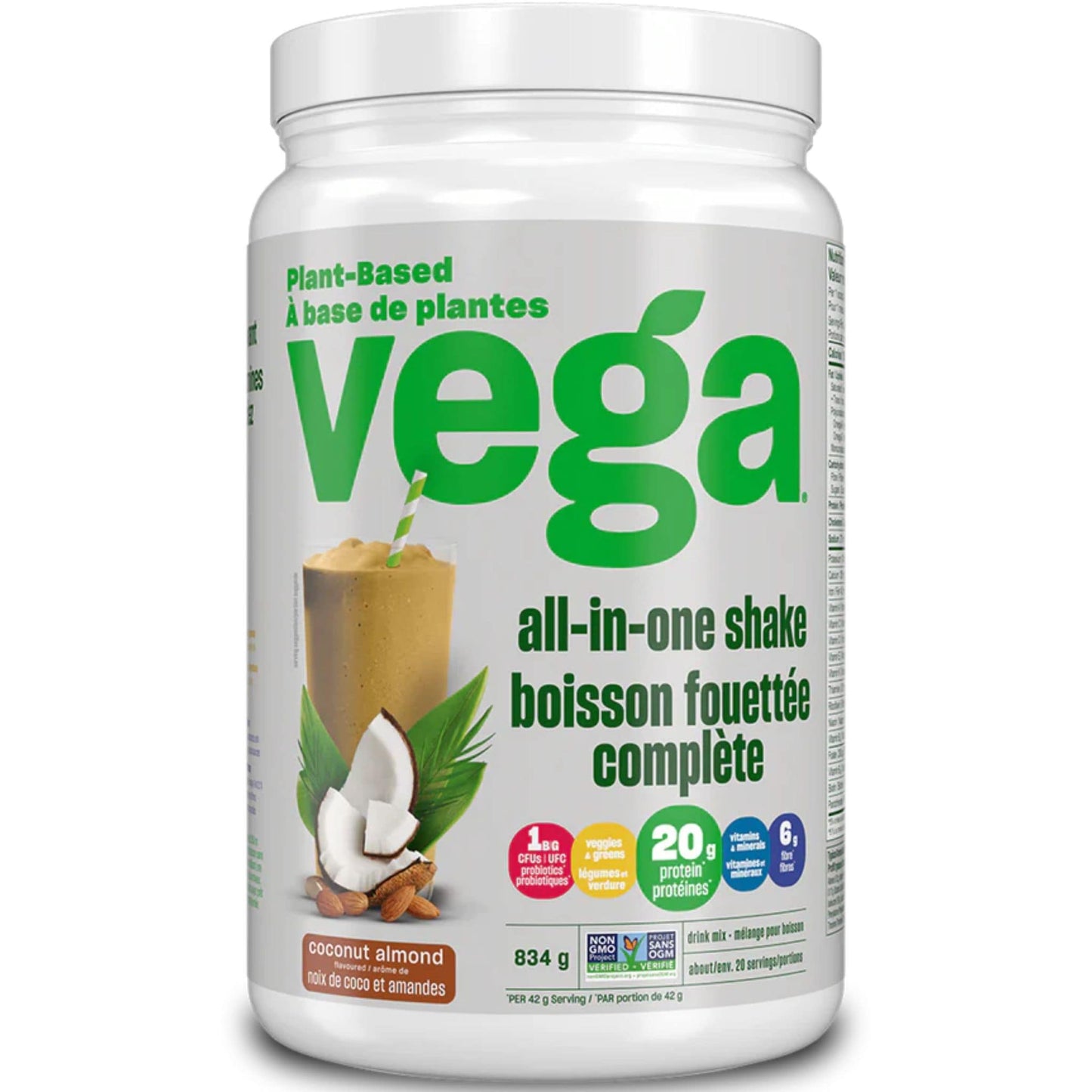 Coconut Almond: Pea protein, Pea starch, Acacia gum, Organic broccoli powder, Organic spirulina powder, Stevia leaf extract, Organic kale powder, Marine algae, Fruit & vegetable extract blend (spinach, broccoli, carrot, beet, tomato, apple, cranberry, orange, blueberry, strawberry, shiitake mushroom, cherry), Xanthan gum, Guar gum, Citric acid, Fruit blend (grape seed extract, mangosteen powder, organic maqui powder, organic pomegranate powder, organic goji powder, acai powder), Rosemary extract, Probiotics (Bacillus Subtilis DE111®), Natural flavours.